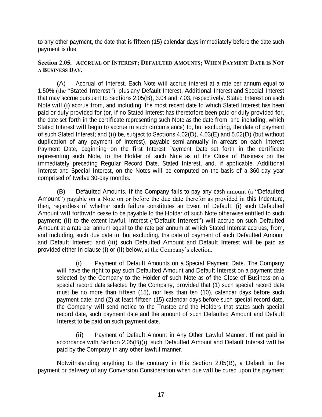 - 17 - to any other payment, the date that is fifteen (15) calendar days immediately before the date such payment is due. Section 2.05. ACCRUAL OF INTEREST; DEFAULTED AMOUNTS; WHEN PAYMENT DATE IS NOT A BUSINESS DAY. (A) Accrual of Interest. Each Note will accrue interest at a rate per annum equal to 1.50% (the “Stated Interest”), plus any Default Interest, Additional Interest and Special Interest that may accrue pursuant to Sections 2.05(B), 3.04 and 7.03, respectively. Stated Interest on each Note will (i) accrue from, and including, the most recent date to which Stated Interest has been paid or duly provided for (or, if no Stated Interest has theretofore been paid or duly provided for, the date set forth in the certificate representing such Note as the date from, and including, which Stated Interest will begin to accrue in such circumstance) to, but excluding, the date of payment of such Stated Interest; and (ii) be, subject to Sections 4.02(D), 4.03(E) and 5.02(D) (but without duplication of any payment of interest), payable semi-annually in arrears on each Interest Payment Date, beginning on the first Interest Payment Date set forth in the certificate representing such Note, to the Holder of such Note as of the Close of Business on the immediately preceding Regular Record Date. Stated Interest, and, if applicable, Additional Interest and Special Interest, on the Notes will be computed on the basis of a 360-day year comprised of twelve 30-day months. (B) Defaulted Amounts. If the Company fails to pay any cash amount (a “Defaulted Amount”) payable on a Note on or before the due date therefor as provided in this Indenture, then, regardless of whether such failure constitutes an Event of Default, (i) such Defaulted Amount will forthwith cease to be payable to the Holder of such Note otherwise entitled to such payment; (ii) to the extent lawful, interest (“Default Interest”) will accrue on such Defaulted Amount at a rate per annum equal to the rate per annum at which Stated Interest accrues, from, and including, such due date to, but excluding, the date of payment of such Defaulted Amount and Default Interest; and (iii) such Defaulted Amount and Default Interest will be paid as provided either in clause (i) or (ii) below, at the Company’s election. (i) Payment of Default Amounts on a Special Payment Date. The Company will have the right to pay such Defaulted Amount and Default Interest on a payment date selected by the Company to the Holder of such Note as of the Close of Business on a special record date selected by the Company, provided that (1) such special record date must be no more than fifteen (15), nor less than ten (10), calendar days before such payment date; and (2) at least fifteen (15) calendar days before such special record date, the Company will send notice to the Trustee and the Holders that states such special record date, such payment date and the amount of such Defaulted Amount and Default Interest to be paid on such payment date. (ii) Payment of Default Amount in Any Other Lawful Manner. If not paid in accordance with Section 2.05(B)(i), such Defaulted Amount and Default Interest will be paid by the Company in any other lawful manner. Notwithstanding anything to the contrary in this Section 2.05(B), a Default in the payment or delivery of any Conversion Consideration when due will be cured upon the payment