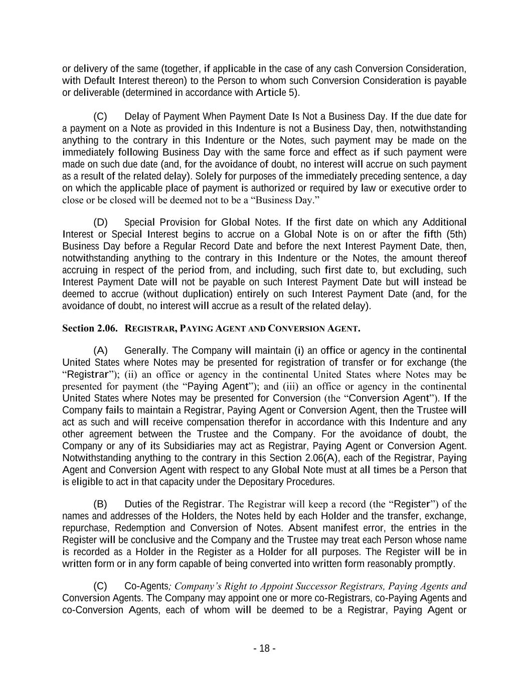 - 18 - or delivery of the same (together, if applicable in the case of any cash Conversion Consideration, with Default Interest thereon) to the Person to whom such Conversion Consideration is payable or deliverable (determined in accordance with Article 5). (C) Delay of Payment When Payment Date Is Not a Business Day. If the due date for a payment on a Note as provided in this Indenture is not a Business Day, then, notwithstanding anything to the contrary in this Indenture or the Notes, such payment may be made on the immediately following Business Day with the same force and effect as if such payment were made on such due date (and, for the avoidance of doubt, no interest will accrue on such payment as a result of the related delay). Solely for purposes of the immediately preceding sentence, a day on which the applicable place of payment is authorized or required by law or executive order to close or be closed will be deemed not to be a “Business Day.” (D) Special Provision for Global Notes. If the first date on which any Additional Interest or Special Interest begins to accrue on a Global Note is on or after the fifth (5th) Business Day before a Regular Record Date and before the next Interest Payment Date, then, notwithstanding anything to the contrary in this Indenture or the Notes, the amount thereof accruing in respect of the period from, and including, such first date to, but excluding, such Interest Payment Date will not be payable on such Interest Payment Date but will instead be deemed to accrue (without duplication) entirely on such Interest Payment Date (and, for the avoidance of doubt, no interest will accrue as a result of the related delay). Section 2.06. REGISTRAR, PAYING AGENT AND CONVERSION AGENT. (A) Generally. The Company will maintain (i) an office or agency in the continental United States where Notes may be presented for registration of transfer or for exchange (the “Registrar”); (ii) an office or agency in the continental United States where Notes may be presented for payment (the “Paying Agent”); and (iii) an office or agency in the continental United States where Notes may be presented for Conversion (the “Conversion Agent”). If the Company fails to maintain a Registrar, Paying Agent or Conversion Agent, then the Trustee will act as such and will receive compensation therefor in accordance with this Indenture and any other agreement between the Trustee and the Company. For the avoidance of doubt, the Company or any of its Subsidiaries may act as Registrar, Paying Agent or Conversion Agent. Notwithstanding anything to the contrary in this Section 2.06(A), each of the Registrar, Paying Agent and Conversion Agent with respect to any Global Note must at all times be a Person that is eligible to act in that capacity under the Depositary Procedures. (B) Duties of the Registrar. The Registrar will keep a record (the “Register”) of the names and addresses of the Holders, the Notes held by each Holder and the transfer, exchange, repurchase, Redemption and Conversion of Notes. Absent manifest error, the entries in the Register will be conclusive and the Company and the Trustee may treat each Person whose name is recorded as a Holder in the Register as a Holder for all purposes. The Register will be in written form or in any form capable of being converted into written form reasonably promptly. (C) Co-Agents; Company’s Right to Appoint Successor Registrars, Paying Agents and Conversion Agents. The Company may appoint one or more co-Registrars, co-Paying Agents and co-Conversion Agents, each of whom will be deemed to be a Registrar, Paying Agent or