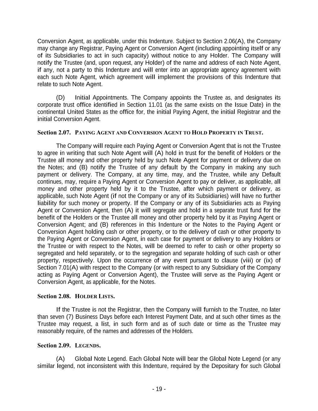 - 19 - Conversion Agent, as applicable, under this Indenture. Subject to Section 2.06(A), the Company may change any Registrar, Paying Agent or Conversion Agent (including appointing itself or any of its Subsidiaries to act in such capacity) without notice to any Holder. The Company will notify the Trustee (and, upon request, any Holder) of the name and address of each Note Agent, if any, not a party to this Indenture and will enter into an appropriate agency agreement with each such Note Agent, which agreement will implement the provisions of this Indenture that relate to such Note Agent. (D) Initial Appointments. The Company appoints the Trustee as, and designates its corporate trust office identified in Section 11.01 (as the same exists on the Issue Date) in the continental United States as the office for, the initial Paying Agent, the initial Registrar and the initial Conversion Agent. Section 2.07. PAYING AGENT AND CONVERSION AGENT TO HOLD PROPERTY IN TRUST. The Company will require each Paying Agent or Conversion Agent that is not the Trustee to agree in writing that such Note Agent will (A) hold in trust for the benefit of Holders or the Trustee all money and other property held by such Note Agent for payment or delivery due on the Notes; and (B) notify the Trustee of any default by the Company in making any such payment or delivery. The Company, at any time, may, and the Trustee, while any Default continues, may, require a Paying Agent or Conversion Agent to pay or deliver, as applicable, all money and other property held by it to the Trustee, after which payment or delivery, as applicable, such Note Agent (if not the Company or any of its Subsidiaries) will have no further liability for such money or property. If the Company or any of its Subsidiaries acts as Paying Agent or Conversion Agent, then (A) it will segregate and hold in a separate trust fund for the benefit of the Holders or the Trustee all money and other property held by it as Paying Agent or Conversion Agent; and (B) references in this Indenture or the Notes to the Paying Agent or Conversion Agent holding cash or other property, or to the delivery of cash or other property to the Paying Agent or Conversion Agent, in each case for payment or delivery to any Holders or the Trustee or with respect to the Notes, will be deemed to refer to cash or other property so segregated and held separately, or to the segregation and separate holding of such cash or other property, respectively. Upon the occurrence of any event pursuant to clause (viii) or (ix) of Section 7.01(A) with respect to the Company (or with respect to any Subsidiary of the Company acting as Paying Agent or Conversion Agent), the Trustee will serve as the Paying Agent or Conversion Agent, as applicable, for the Notes. Section 2.08. HOLDER LISTS. If the Trustee is not the Registrar, then the Company will furnish to the Trustee, no later than seven (7) Business Days before each Interest Payment Date, and at such other times as the Trustee may request, a list, in such form and as of such date or time as the Trustee may reasonably require, of the names and addresses of the Holders. Section 2.09. LEGENDS. (A) Global Note Legend. Each Global Note will bear the Global Note Legend (or any similar legend, not inconsistent with this Indenture, required by the Depositary for such Global