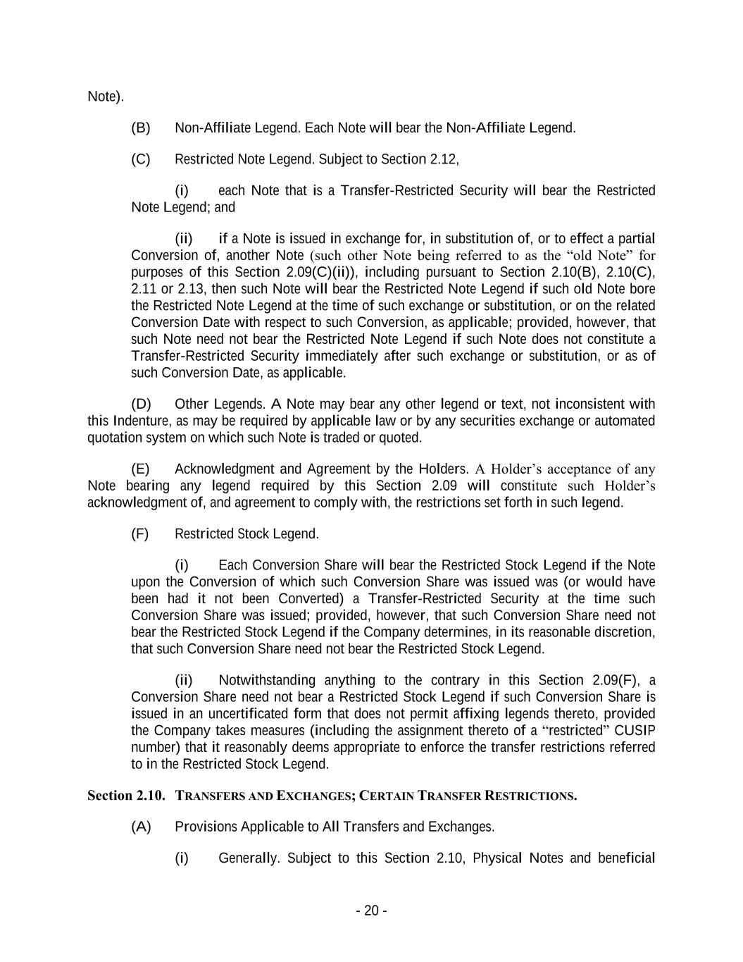 - 20 - Note). (B) Non-Affiliate Legend. Each Note will bear the Non-Affiliate Legend. (C) Restricted Note Legend. Subject to Section 2.12, (i) each Note that is a Transfer-Restricted Security will bear the Restricted Note Legend; and (ii) if a Note is issued in exchange for, in substitution of, or to effect a partial Conversion of, another Note (such other Note being referred to as the “old Note” for purposes of this Section 2.09(C)(ii)), including pursuant to Section 2.10(B), 2.10(C), 2.11 or 2.13, then such Note will bear the Restricted Note Legend if such old Note bore the Restricted Note Legend at the time of such exchange or substitution, or on the related Conversion Date with respect to such Conversion, as applicable; provided, however, that such Note need not bear the Restricted Note Legend if such Note does not constitute a Transfer-Restricted Security immediately after such exchange or substitution, or as of such Conversion Date, as applicable. (D) Other Legends. A Note may bear any other legend or text, not inconsistent with this Indenture, as may be required by applicable law or by any securities exchange or automated quotation system on which such Note is traded or quoted. (E) Acknowledgment and Agreement by the Holders. A Holder’s acceptance of any Note bearing any legend required by this Section 2.09 will constitute such Holder’s acknowledgment of, and agreement to comply with, the restrictions set forth in such legend. (F) Restricted Stock Legend. (i) Each Conversion Share will bear the Restricted Stock Legend if the Note upon the Conversion of which such Conversion Share was issued was (or would have been had it not been Converted) a Transfer-Restricted Security at the time such Conversion Share was issued; provided, however, that such Conversion Share need not bear the Restricted Stock Legend if the Company determines, in its reasonable discretion, that such Conversion Share need not bear the Restricted Stock Legend. (ii) Notwithstanding anything to the contrary in this Section 2.09(F), a Conversion Share need not bear a Restricted Stock Legend if such Conversion Share is issued in an uncertificated form that does not permit affixing legends thereto, provided the Company takes measures (including the assignment thereto of a “restricted” CUSIP number) that it reasonably deems appropriate to enforce the transfer restrictions referred to in the Restricted Stock Legend. Section 2.10. TRANSFERS AND EXCHANGES; CERTAIN TRANSFER RESTRICTIONS. (A) Provisions Applicable to All Transfers and Exchanges. (i) Generally. Subject to this Section 2.10, Physical Notes and beneficial