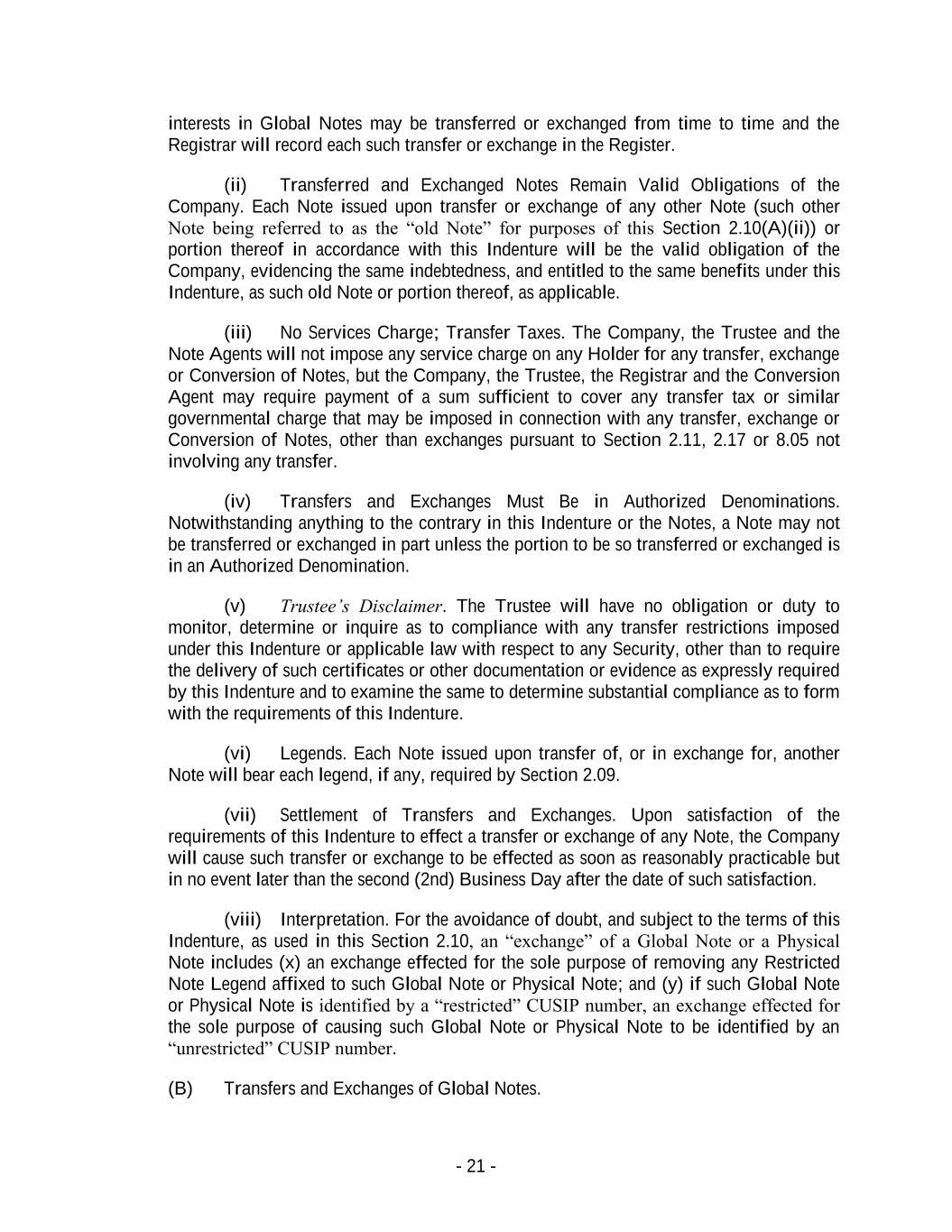 - 21 - interests in Global Notes may be transferred or exchanged from time to time and the Registrar will record each such transfer or exchange in the Register. (ii) Transferred and Exchanged Notes Remain Valid Obligations of the Company. Each Note issued upon transfer or exchange of any other Note (such other Note being referred to as the “old Note” for purposes of this Section 2.10(A)(ii)) or portion thereof in accordance with this Indenture will be the valid obligation of the Company, evidencing the same indebtedness, and entitled to the same benefits under this Indenture, as such old Note or portion thereof, as applicable. (iii) No Services Charge; Transfer Taxes. The Company, the Trustee and the Note Agents will not impose any service charge on any Holder for any transfer, exchange or Conversion of Notes, but the Company, the Trustee, the Registrar and the Conversion Agent may require payment of a sum sufficient to cover any transfer tax or similar governmental charge that may be imposed in connection with any transfer, exchange or Conversion of Notes, other than exchanges pursuant to Section 2.11, 2.17 or 8.05 not involving any transfer. (iv) Transfers and Exchanges Must Be in Authorized Denominations. Notwithstanding anything to the contrary in this Indenture or the Notes, a Note may not be transferred or exchanged in part unless the portion to be so transferred or exchanged is in an Authorized Denomination. (v) Trustee’s Disclaimer. The Trustee will have no obligation or duty to monitor, determine or inquire as to compliance with any transfer restrictions imposed under this Indenture or applicable law with respect to any Security, other than to require the delivery of such certificates or other documentation or evidence as expressly required by this Indenture and to examine the same to determine substantial compliance as to form with the requirements of this Indenture. (vi) Legends. Each Note issued upon transfer of, or in exchange for, another Note will bear each legend, if any, required by Section 2.09. (vii) Settlement of Transfers and Exchanges. Upon satisfaction of the requirements of this Indenture to effect a transfer or exchange of any Note, the Company will cause such transfer or exchange to be effected as soon as reasonably practicable but in no event later than the second (2nd) Business Day after the date of such satisfaction. (viii) Interpretation. For the avoidance of doubt, and subject to the terms of this Indenture, as used in this Section 2.10, an “exchange” of a Global Note or a Physical Note includes (x) an exchange effected for the sole purpose of removing any Restricted Note Legend affixed to such Global Note or Physical Note; and (y) if such Global Note or Physical Note is identified by a “restricted” CUSIP number, an exchange effected for the sole purpose of causing such Global Note or Physical Note to be identified by an “unrestricted” CUSIP number. (B) Transfers and Exchanges of Global Notes.