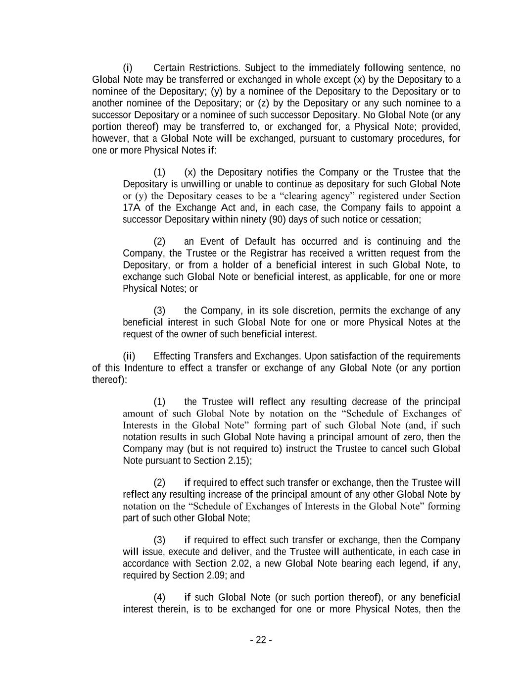 - 22 - (i) Certain Restrictions. Subject to the immediately following sentence, no Global Note may be transferred or exchanged in whole except (x) by the Depositary to a nominee of the Depositary; (y) by a nominee of the Depositary to the Depositary or to another nominee of the Depositary; or (z) by the Depositary or any such nominee to a successor Depositary or a nominee of such successor Depositary. No Global Note (or any portion thereof) may be transferred to, or exchanged for, a Physical Note; provided, however, that a Global Note will be exchanged, pursuant to customary procedures, for one or more Physical Notes if: (1) (x) the Depositary notifies the Company or the Trustee that the Depositary is unwilling or unable to continue as depositary for such Global Note or (y) the Depositary ceases to be a “clearing agency” registered under Section 17A of the Exchange Act and, in each case, the Company fails to appoint a successor Depositary within ninety (90) days of such notice or cessation; (2) an Event of Default has occurred and is continuing and the Company, the Trustee or the Registrar has received a written request from the Depositary, or from a holder of a beneficial interest in such Global Note, to exchange such Global Note or beneficial interest, as applicable, for one or more Physical Notes; or (3) the Company, in its sole discretion, permits the exchange of any beneficial interest in such Global Note for one or more Physical Notes at the request of the owner of such beneficial interest. (ii) Effecting Transfers and Exchanges. Upon satisfaction of the requirements of this Indenture to effect a transfer or exchange of any Global Note (or any portion thereof): (1) the Trustee will reflect any resulting decrease of the principal amount of such Global Note by notation on the “Schedule of Exchanges of Interests in the Global Note” forming part of such Global Note (and, if such notation results in such Global Note having a principal amount of zero, then the Company may (but is not required to) instruct the Trustee to cancel such Global Note pursuant to Section 2.15); (2) if required to effect such transfer or exchange, then the Trustee will reflect any resulting increase of the principal amount of any other Global Note by notation on the “Schedule of Exchanges of Interests in the Global Note” forming part of such other Global Note; (3) if required to effect such transfer or exchange, then the Company will issue, execute and deliver, and the Trustee will authenticate, in each case in accordance with Section 2.02, a new Global Note bearing each legend, if any, required by Section 2.09; and (4) if such Global Note (or such portion thereof), or any beneficial interest therein, is to be exchanged for one or more Physical Notes, then the