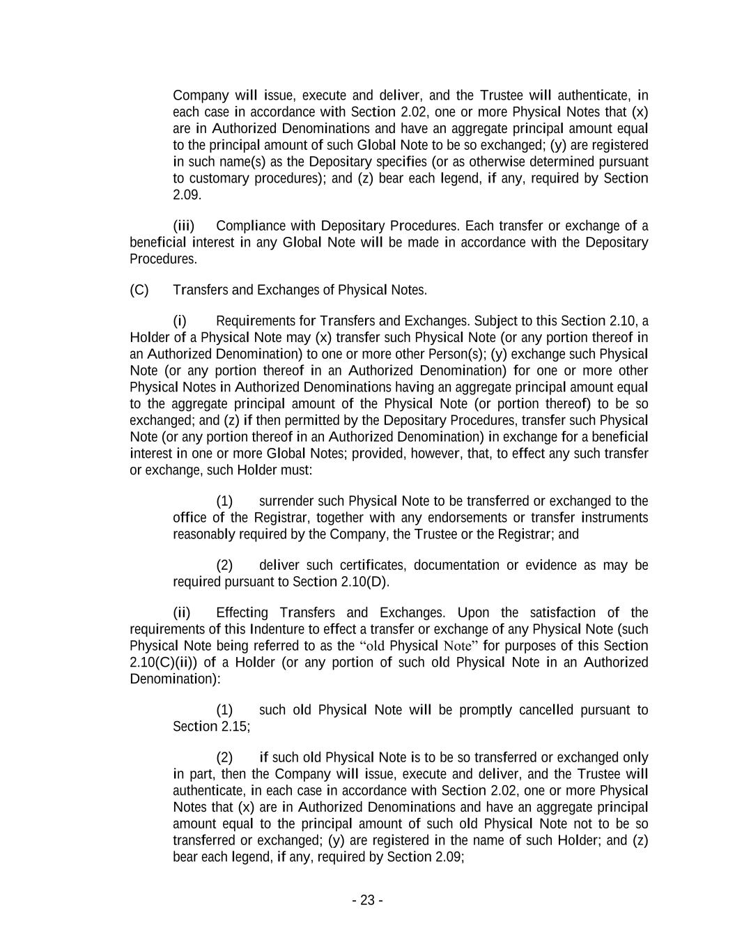 - 23 - Company will issue, execute and deliver, and the Trustee will authenticate, in each case in accordance with Section 2.02, one or more Physical Notes that (x) are in Authorized Denominations and have an aggregate principal amount equal to the principal amount of such Global Note to be so exchanged; (y) are registered in such name(s) as the Depositary specifies (or as otherwise determined pursuant to customary procedures); and (z) bear each legend, if any, required by Section 2.09. (iii) Compliance with Depositary Procedures. Each transfer or exchange of a beneficial interest in any Global Note will be made in accordance with the Depositary Procedures. (C) Transfers and Exchanges of Physical Notes. (i) Requirements for Transfers and Exchanges. Subject to this Section 2.10, a Holder of a Physical Note may (x) transfer such Physical Note (or any portion thereof in an Authorized Denomination) to one or more other Person(s); (y) exchange such Physical Note (or any portion thereof in an Authorized Denomination) for one or more other Physical Notes in Authorized Denominations having an aggregate principal amount equal to the aggregate principal amount of the Physical Note (or portion thereof) to be so exchanged; and (z) if then permitted by the Depositary Procedures, transfer such Physical Note (or any portion thereof in an Authorized Denomination) in exchange for a beneficial interest in one or more Global Notes; provided, however, that, to effect any such transfer or exchange, such Holder must: (1) surrender such Physical Note to be transferred or exchanged to the office of the Registrar, together with any endorsements or transfer instruments reasonably required by the Company, the Trustee or the Registrar; and (2) deliver such certificates, documentation or evidence as may be required pursuant to Section 2.10(D). (ii) Effecting Transfers and Exchanges. Upon the satisfaction of the requirements of this Indenture to effect a transfer or exchange of any Physical Note (such Physical Note being referred to as the “old Physical Note” for purposes of this Section 2.10(C)(ii)) of a Holder (or any portion of such old Physical Note in an Authorized Denomination): (1) such old Physical Note will be promptly cancelled pursuant to Section 2.15; (2) if such old Physical Note is to be so transferred or exchanged only in part, then the Company will issue, execute and deliver, and the Trustee will authenticate, in each case in accordance with Section 2.02, one or more Physical Notes that (x) are in Authorized Denominations and have an aggregate principal amount equal to the principal amount of such old Physical Note not to be so transferred or exchanged; (y) are registered in the name of such Holder; and (z) bear each legend, if any, required by Section 2.09;