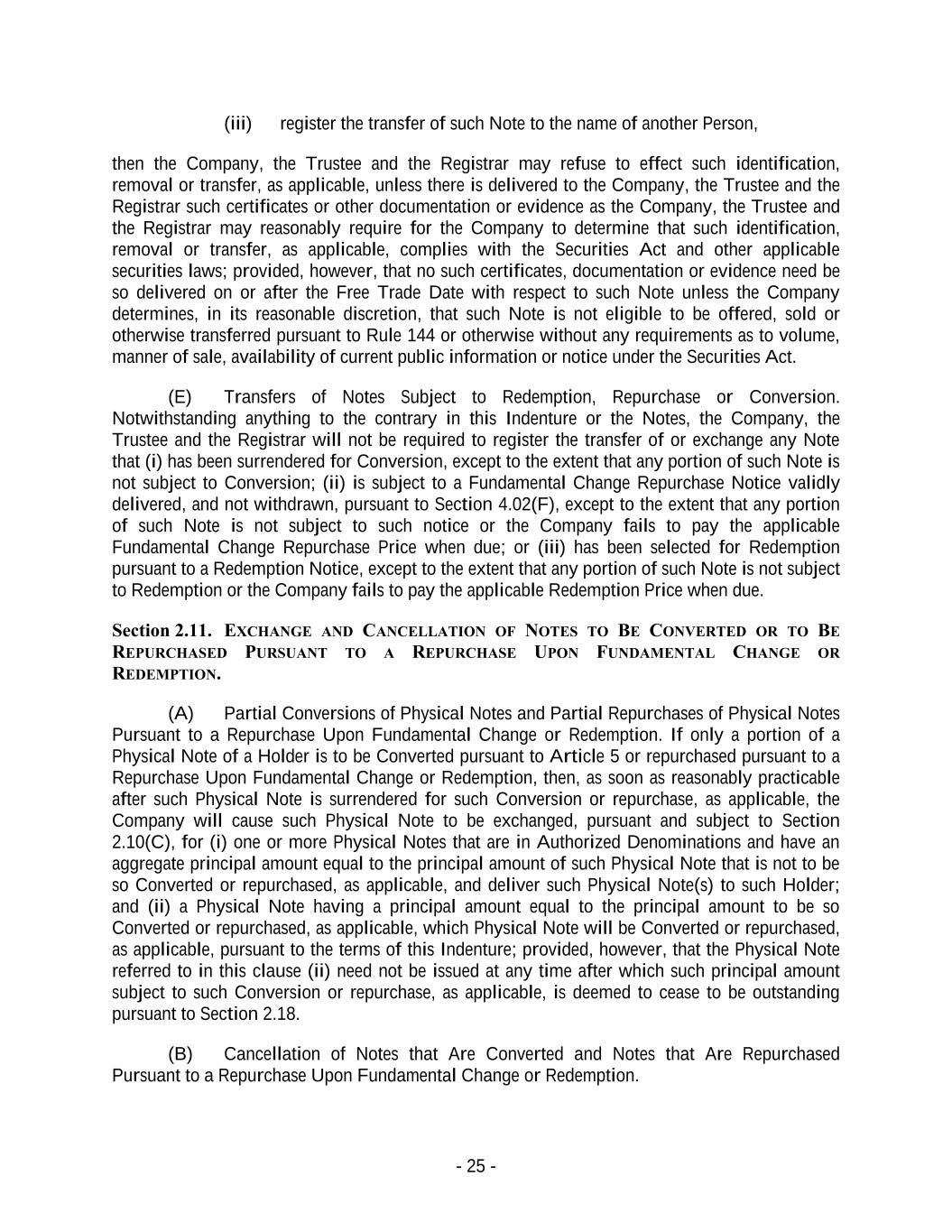 - 25 - (iii) register the transfer of such Note to the name of another Person, then the Company, the Trustee and the Registrar may refuse to effect such identification, removal or transfer, as applicable, unless there is delivered to the Company, the Trustee and the Registrar such certificates or other documentation or evidence as the Company, the Trustee and the Registrar may reasonably require for the Company to determine that such identification, removal or transfer, as applicable, complies with the Securities Act and other applicable securities laws; provided, however, that no such certificates, documentation or evidence need be so delivered on or after the Free Trade Date with respect to such Note unless the Company determines, in its reasonable discretion, that such Note is not eligible to be offered, sold or otherwise transferred pursuant to Rule 144 or otherwise without any requirements as to volume, manner of sale, availability of current public information or notice under the Securities Act. (E) Transfers of Notes Subject to Redemption, Repurchase or Conversion. Notwithstanding anything to the contrary in this Indenture or the Notes, the Company, the Trustee and the Registrar will not be required to register the transfer of or exchange any Note that (i) has been surrendered for Conversion, except to the extent that any portion of such Note is not subject to Conversion; (ii) is subject to a Fundamental Change Repurchase Notice validly delivered, and not withdrawn, pursuant to Section 4.02(F), except to the extent that any portion of such Note is not subject to such notice or the Company fails to pay the applicable Fundamental Change Repurchase Price when due; or (iii) has been selected for Redemption pursuant to a Redemption Notice, except to the extent that any portion of such Note is not subject to Redemption or the Company fails to pay the applicable Redemption Price when due. Section 2.11. EXCHANGE AND CANCELLATION OF NOTES TO BE CONVERTED OR TO BE REPURCHASED PURSUANT TO A REPURCHASE UPON FUNDAMENTAL CHANGE OR REDEMPTION. (A) Partial Conversions of Physical Notes and Partial Repurchases of Physical Notes Pursuant to a Repurchase Upon Fundamental Change or Redemption. If only a portion of a Physical Note of a Holder is to be Converted pursuant to Article 5 or repurchased pursuant to a Repurchase Upon Fundamental Change or Redemption, then, as soon as reasonably practicable after such Physical Note is surrendered for such Conversion or repurchase, as applicable, the Company will cause such Physical Note to be exchanged, pursuant and subject to Section 2.10(C), for (i) one or more Physical Notes that are in Authorized Denominations and have an aggregate principal amount equal to the principal amount of such Physical Note that is not to be so Converted or repurchased, as applicable, and deliver such Physical Note(s) to such Holder; and (ii) a Physical Note having a principal amount equal to the principal amount to be so Converted or repurchased, as applicable, which Physical Note will be Converted or repurchased, as applicable, pursuant to the terms of this Indenture; provided, however, that the Physical Note referred to in this clause (ii) need not be issued at any time after which such principal amount subject to such Conversion or repurchase, as applicable, is deemed to cease to be outstanding pursuant to Section 2.18. (B) Cancellation of Notes that Are Converted and Notes that Are Repurchased Pursuant to a Repurchase Upon Fundamental Change or Redemption.