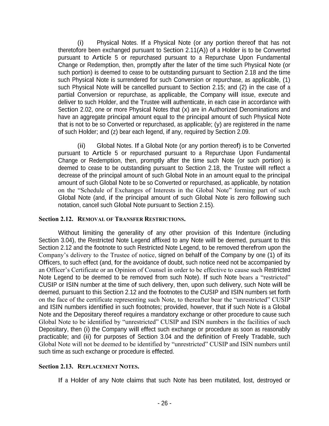 - 26 - (i) Physical Notes. If a Physical Note (or any portion thereof that has not theretofore been exchanged pursuant to Section 2.11(A)) of a Holder is to be Converted pursuant to Article 5 or repurchased pursuant to a Repurchase Upon Fundamental Change or Redemption, then, promptly after the later of the time such Physical Note (or such portion) is deemed to cease to be outstanding pursuant to Section 2.18 and the time such Physical Note is surrendered for such Conversion or repurchase, as applicable, (1) such Physical Note will be cancelled pursuant to Section 2.15; and (2) in the case of a partial Conversion or repurchase, as applicable, the Company will issue, execute and deliver to such Holder, and the Trustee will authenticate, in each case in accordance with Section 2.02, one or more Physical Notes that (x) are in Authorized Denominations and have an aggregate principal amount equal to the principal amount of such Physical Note that is not to be so Converted or repurchased, as applicable; (y) are registered in the name of such Holder; and (z) bear each legend, if any, required by Section 2.09. (ii) Global Notes. If a Global Note (or any portion thereof) is to be Converted pursuant to Article 5 or repurchased pursuant to a Repurchase Upon Fundamental Change or Redemption, then, promptly after the time such Note (or such portion) is deemed to cease to be outstanding pursuant to Section 2.18, the Trustee will reflect a decrease of the principal amount of such Global Note in an amount equal to the principal amount of such Global Note to be so Converted or repurchased, as applicable, by notation on the “Schedule of Exchanges of Interests in the Global Note” forming part of such Global Note (and, if the principal amount of such Global Note is zero following such notation, cancel such Global Note pursuant to Section 2.15). Section 2.12. REMOVAL OF TRANSFER RESTRICTIONS. Without limiting the generality of any other provision of this Indenture (including Section 3.04), the Restricted Note Legend affixed to any Note will be deemed, pursuant to this Section 2.12 and the footnote to such Restricted Note Legend, to be removed therefrom upon the Company’s delivery to the Trustee of notice, signed on behalf of the Company by one (1) of its Officers, to such effect (and, for the avoidance of doubt, such notice need not be accompanied by an Officer’s Certificate or an Opinion of Counsel in order to be effective to cause such Restricted Note Legend to be deemed to be removed from such Note). If such Note bears a “restricted” CUSIP or ISIN number at the time of such delivery, then, upon such delivery, such Note will be deemed, pursuant to this Section 2.12 and the footnotes to the CUSIP and ISIN numbers set forth on the face of the certificate representing such Note, to thereafter bear the “unrestricted” CUSIP and ISIN numbers identified in such footnotes; provided, however, that if such Note is a Global Note and the Depositary thereof requires a mandatory exchange or other procedure to cause such Global Note to be identified by “unrestricted” CUSIP and ISIN numbers in the facilities of such Depositary, then (i) the Company will effect such exchange or procedure as soon as reasonably practicable; and (ii) for purposes of Section 3.04 and the definition of Freely Tradable, such Global Note will not be deemed to be identified by “unrestricted” CUSIP and ISIN numbers until such time as such exchange or procedure is effected. Section 2.13. REPLACEMENT NOTES. If a Holder of any Note claims that such Note has been mutilated, lost, destroyed or