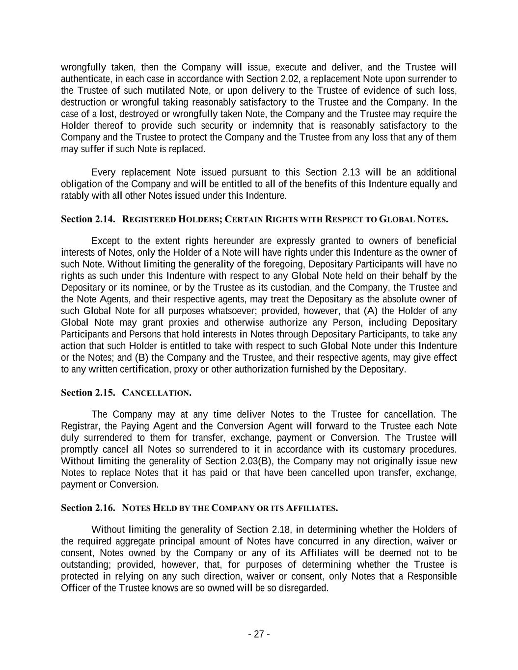 - 27 - wrongfully taken, then the Company will issue, execute and deliver, and the Trustee will authenticate, in each case in accordance with Section 2.02, a replacement Note upon surrender to the Trustee of such mutilated Note, or upon delivery to the Trustee of evidence of such loss, destruction or wrongful taking reasonably satisfactory to the Trustee and the Company. In the case of a lost, destroyed or wrongfully taken Note, the Company and the Trustee may require the Holder thereof to provide such security or indemnity that is reasonably satisfactory to the Company and the Trustee to protect the Company and the Trustee from any loss that any of them may suffer if such Note is replaced. Every replacement Note issued pursuant to this Section 2.13 will be an additional obligation of the Company and will be entitled to all of the benefits of this Indenture equally and ratably with all other Notes issued under this Indenture. Section 2.14. REGISTERED HOLDERS; CERTAIN RIGHTS WITH RESPECT TO GLOBAL NOTES. Except to the extent rights hereunder are expressly granted to owners of beneficial interests of Notes, only the Holder of a Note will have rights under this Indenture as the owner of such Note. Without limiting the generality of the foregoing, Depositary Participants will have no rights as such under this Indenture with respect to any Global Note held on their behalf by the Depositary or its nominee, or by the Trustee as its custodian, and the Company, the Trustee and the Note Agents, and their respective agents, may treat the Depositary as the absolute owner of such Global Note for all purposes whatsoever; provided, however, that (A) the Holder of any Global Note may grant proxies and otherwise authorize any Person, including Depositary Participants and Persons that hold interests in Notes through Depositary Participants, to take any action that such Holder is entitled to take with respect to such Global Note under this Indenture or the Notes; and (B) the Company and the Trustee, and their respective agents, may give effect to any written certification, proxy or other authorization furnished by the Depositary. Section 2.15. CANCELLATION. The Company may at any time deliver Notes to the Trustee for cancellation. The Registrar, the Paying Agent and the Conversion Agent will forward to the Trustee each Note duly surrendered to them for transfer, exchange, payment or Conversion. The Trustee will promptly cancel all Notes so surrendered to it in accordance with its customary procedures. Without limiting the generality of Section 2.03(B), the Company may not originally issue new Notes to replace Notes that it has paid or that have been cancelled upon transfer, exchange, payment or Conversion. Section 2.16. NOTES HELD BY THE COMPANY OR ITS AFFILIATES. Without limiting the generality of Section 2.18, in determining whether the Holders of the required aggregate principal amount of Notes have concurred in any direction, waiver or consent, Notes owned by the Company or any of its Affiliates will be deemed not to be outstanding; provided, however, that, for purposes of determining whether the Trustee is protected in relying on any such direction, waiver or consent, only Notes that a Responsible Officer of the Trustee knows are so owned will be so disregarded.