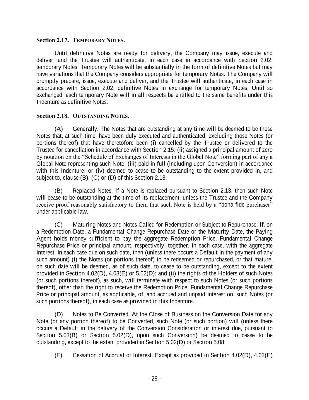- 28 - Section 2.17. TEMPORARY NOTES. Until definitive Notes are ready for delivery, the Company may issue, execute and deliver, and the Trustee will authenticate, in each case in accordance with Section 2.02, temporary Notes. Temporary Notes will be substantially in the form of definitive Notes but may have variations that the Company considers appropriate for temporary Notes. The Company will promptly prepare, issue, execute and deliver, and the Trustee will authenticate, in each case in accordance with Section 2.02, definitive Notes in exchange for temporary Notes. Until so exchanged, each temporary Note will in all respects be entitled to the same benefits under this Indenture as definitive Notes. Section 2.18. OUTSTANDING NOTES. (A) Generally. The Notes that are outstanding at any time will be deemed to be those Notes that, at such time, have been duly executed and authenticated, excluding those Notes (or portions thereof) that have theretofore been (i) cancelled by the Trustee or delivered to the Trustee for cancellation in accordance with Section 2.15; (ii) assigned a principal amount of zero by notation on the “Schedule of Exchanges of Interests in the Global Note” forming part of any a Global Note representing such Note; (iii) paid in full (including upon Conversion) in accordance with this Indenture; or (iv) deemed to cease to be outstanding to the extent provided in, and subject to, clause (B), (C) or (D) of this Section 2.18. (B) Replaced Notes. If a Note is replaced pursuant to Section 2.13, then such Note will cease to be outstanding at the time of its replacement, unless the Trustee and the Company receive proof reasonably satisfactory to them that such Note is held by a “bona fide purchaser” under applicable law. (C) Maturing Notes and Notes Called for Redemption or Subject to Repurchase. If, on a Redemption Date, a Fundamental Change Repurchase Date or the Maturity Date, the Paying Agent holds money sufficient to pay the aggregate Redemption Price, Fundamental Change Repurchase Price or principal amount, respectively, together, in each case, with the aggregate interest, in each case due on such date, then (unless there occurs a Default in the payment of any such amount) (i) the Notes (or portions thereof) to be redeemed or repurchased, or that mature, on such date will be deemed, as of such date, to cease to be outstanding, except to the extent provided in Section 4.02(D), 4.03(E) or 5.02(D); and (ii) the rights of the Holders of such Notes (or such portions thereof), as such, will terminate with respect to such Notes (or such portions thereof), other than the right to receive the Redemption Price, Fundamental Change Repurchase Price or principal amount, as applicable, of, and accrued and unpaid interest on, such Notes (or such portions thereof), in each case as provided in this Indenture. (D) Notes to Be Converted. At the Close of Business on the Conversion Date for any Note (or any portion thereof) to be Converted, such Note (or such portion) will (unless there occurs a Default in the delivery of the Conversion Consideration or interest due, pursuant to Section 5.03(B) or Section 5.02(D), upon such Conversion) be deemed to cease to be outstanding, except to the extent provided in Section 5.02(D) or Section 5.08. (E) Cessation of Accrual of Interest. Except as provided in Section 4.02(D), 4.03(E)