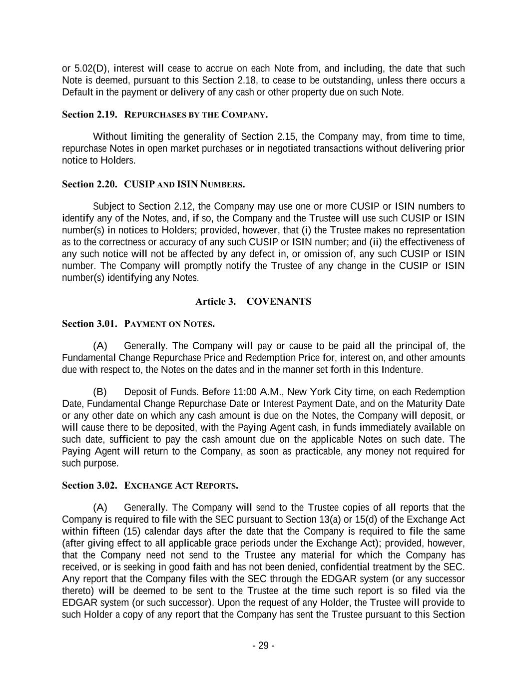 - 29 - or 5.02(D), interest will cease to accrue on each Note from, and including, the date that such Note is deemed, pursuant to this Section 2.18, to cease to be outstanding, unless there occurs a Default in the payment or delivery of any cash or other property due on such Note. Section 2.19. REPURCHASES BY THE COMPANY. Without limiting the generality of Section 2.15, the Company may, from time to time, repurchase Notes in open market purchases or in negotiated transactions without delivering prior notice to Holders. Section 2.20. CUSIP AND ISIN NUMBERS. Subject to Section 2.12, the Company may use one or more CUSIP or ISIN numbers to identify any of the Notes, and, if so, the Company and the Trustee will use such CUSIP or ISIN number(s) in notices to Holders; provided, however, that (i) the Trustee makes no representation as to the correctness or accuracy of any such CUSIP or ISIN number; and (ii) the effectiveness of any such notice will not be affected by any defect in, or omission of, any such CUSIP or ISIN number. The Company will promptly notify the Trustee of any change in the CUSIP or ISIN number(s) identifying any Notes. Article 3. COVENANTS Section 3.01. PAYMENT ON NOTES. (A) Generally. The Company will pay or cause to be paid all the principal of, the Fundamental Change Repurchase Price and Redemption Price for, interest on, and other amounts due with respect to, the Notes on the dates and in the manner set forth in this Indenture. (B) Deposit of Funds. Before 11:00 A.M., New York City time, on each Redemption Date, Fundamental Change Repurchase Date or Interest Payment Date, and on the Maturity Date or any other date on which any cash amount is due on the Notes, the Company will deposit, or will cause there to be deposited, with the Paying Agent cash, in funds immediately available on such date, sufficient to pay the cash amount due on the applicable Notes on such date. The Paying Agent will return to the Company, as soon as practicable, any money not required for such purpose. Section 3.02. EXCHANGE ACT REPORTS. (A) Generally. The Company will send to the Trustee copies of all reports that the Company is required to file with the SEC pursuant to Section 13(a) or 15(d) of the Exchange Act within fifteen (15) calendar days after the date that the Company is required to file the same (after giving effect to all applicable grace periods under the Exchange Act); provided, however, that the Company need not send to the Trustee any material for which the Company has received, or is seeking in good faith and has not been denied, confidential treatment by the SEC. Any report that the Company files with the SEC through the EDGAR system (or any successor thereto) will be deemed to be sent to the Trustee at the time such report is so filed via the EDGAR system (or such successor). Upon the request of any Holder, the Trustee will provide to such Holder a copy of any report that the Company has sent the Trustee pursuant to this Section