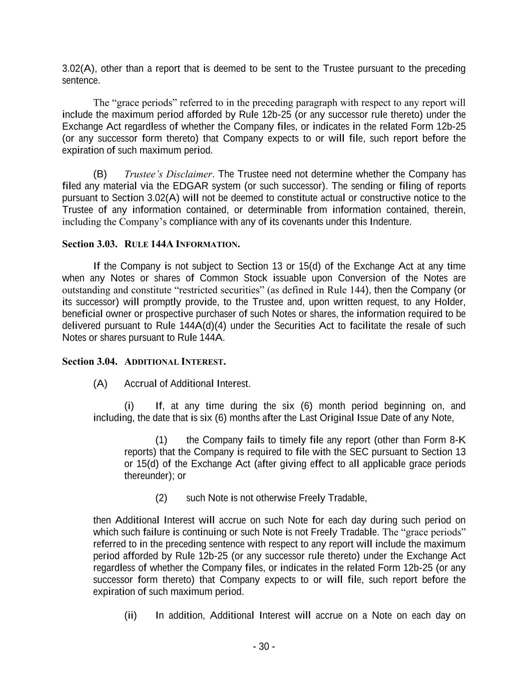 - 30 - 3.02(A), other than a report that is deemed to be sent to the Trustee pursuant to the preceding sentence. The “grace periods” referred to in the preceding paragraph with respect to any report will include the maximum period afforded by Rule 12b-25 (or any successor rule thereto) under the Exchange Act regardless of whether the Company files, or indicates in the related Form 12b-25 (or any successor form thereto) that Company expects to or will file, such report before the expiration of such maximum period. (B) Trustee’s Disclaimer. The Trustee need not determine whether the Company has filed any material via the EDGAR system (or such successor). The sending or filing of reports pursuant to Section 3.02(A) will not be deemed to constitute actual or constructive notice to the Trustee of any information contained, or determinable from information contained, therein, including the Company’s compliance with any of its covenants under this Indenture. Section 3.03. RULE 144A INFORMATION. If the Company is not subject to Section 13 or 15(d) of the Exchange Act at any time when any Notes or shares of Common Stock issuable upon Conversion of the Notes are outstanding and constitute “restricted securities” (as defined in Rule 144), then the Company (or its successor) will promptly provide, to the Trustee and, upon written request, to any Holder, beneficial owner or prospective purchaser of such Notes or shares, the information required to be delivered pursuant to Rule 144A(d)(4) under the Securities Act to facilitate the resale of such Notes or shares pursuant to Rule 144A. Section 3.04. ADDITIONAL INTEREST. (A) Accrual of Additional Interest. (i) If, at any time during the six (6) month period beginning on, and including, the date that is six (6) months after the Last Original Issue Date of any Note, (1) the Company fails to timely file any report (other than Form 8-K reports) that the Company is required to file with the SEC pursuant to Section 13 or 15(d) of the Exchange Act (after giving effect to all applicable grace periods thereunder); or (2) such Note is not otherwise Freely Tradable, then Additional Interest will accrue on such Note for each day during such period on which such failure is continuing or such Note is not Freely Tradable. The “grace periods” referred to in the preceding sentence with respect to any report will include the maximum period afforded by Rule 12b-25 (or any successor rule thereto) under the Exchange Act regardless of whether the Company files, or indicates in the related Form 12b-25 (or any successor form thereto) that Company expects to or will file, such report before the expiration of such maximum period. (ii) In addition, Additional Interest will accrue on a Note on each day on