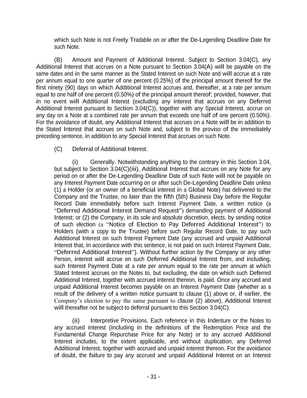 - 31 - which such Note is not Freely Tradable on or after the De-Legending Deadline Date for such Note. (B) Amount and Payment of Additional Interest. Subject to Section 3.04(C), any Additional Interest that accrues on a Note pursuant to Section 3.04(A) will be payable on the same dates and in the same manner as the Stated Interest on such Note and will accrue at a rate per annum equal to one quarter of one percent (0.25%) of the principal amount thereof for the first ninety (90) days on which Additional Interest accrues and, thereafter, at a rate per annum equal to one half of one percent (0.50%) of the principal amount thereof; provided, however, that in no event will Additional Interest (excluding any interest that accrues on any Deferred Additional Interest pursuant to Section 3.04(C)), together with any Special Interest, accrue on any day on a Note at a combined rate per annum that exceeds one half of one percent (0.50%). For the avoidance of doubt, any Additional Interest that accrues on a Note will be in addition to the Stated Interest that accrues on such Note and, subject to the proviso of the immediately preceding sentence, in addition to any Special Interest that accrues on such Note. (C) Deferral of Additional Interest. (i) Generally. Notwithstanding anything to the contrary in this Section 3.04, but subject to Section 3.04(C)(iii), Additional Interest that accrues on any Note for any period on or after the De-Legending Deadline Date of such Note will not be payable on any Interest Payment Date occurring on or after such De-Legending Deadline Date unless (1) a Holder (or an owner of a beneficial interest in a Global Note) has delivered to the Company and the Trustee, no later than the fifth (5th) Business Day before the Regular Record Date immediately before such Interest Payment Date, a written notice (a “Deferred Additional Interest Demand Request”) demanding payment of Additional Interest; or (2) the Company, in its sole and absolute discretion, elects, by sending notice of such election (a “Notice of Election to Pay Deferred Additional Interest”) to Holders (with a copy to the Trustee) before such Regular Record Date, to pay such Additional Interest on such Interest Payment Date (any accrued and unpaid Additional Interest that, in accordance with this sentence, is not paid on such Interest Payment Date, “Deferred Additional Interest”). Without further action by the Company or any other Person, interest will accrue on such Deferred Additional Interest from, and including, such Interest Payment Date at a rate per annum equal to the rate per annum at which Stated Interest accrues on the Notes to, but excluding, the date on which such Deferred Additional Interest, together with accrued interest thereon, is paid. Once any accrued and unpaid Additional Interest becomes payable on an Interest Payment Date (whether as a result of the delivery of a written notice pursuant to clause (1) above or, if earlier, the Company’s election to pay the same pursuant to clause (2) above), Additional Interest will thereafter not be subject to deferral pursuant to this Section 3.04(C). (ii) Interpretive Provisions. Each reference in this Indenture or the Notes to any accrued interest (including in the definitions of the Redemption Price and the Fundamental Change Repurchase Price for any Note) or to any accrued Additional Interest includes, to the extent applicable, and without duplication, any Deferred Additional Interest, together with accrued and unpaid interest thereon. For the avoidance of doubt, the failure to pay any accrued and unpaid Additional Interest on an Interest