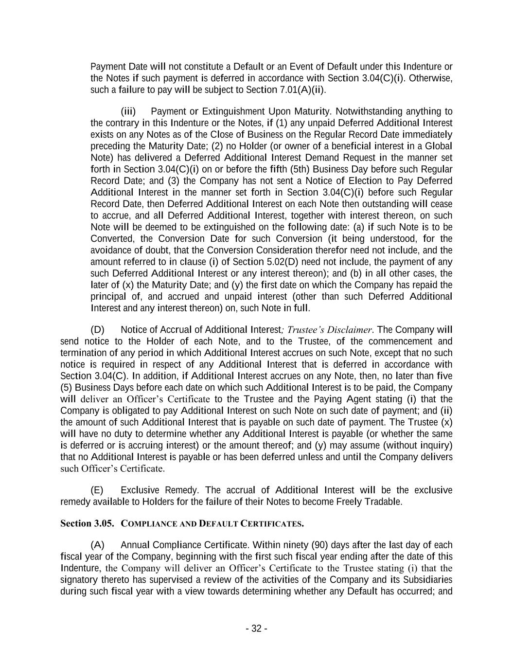 - 32 - Payment Date will not constitute a Default or an Event of Default under this Indenture or the Notes if such payment is deferred in accordance with Section 3.04(C)(i). Otherwise, such a failure to pay will be subject to Section 7.01(A)(ii). (iii) Payment or Extinguishment Upon Maturity. Notwithstanding anything to the contrary in this Indenture or the Notes, if (1) any unpaid Deferred Additional Interest exists on any Notes as of the Close of Business on the Regular Record Date immediately preceding the Maturity Date; (2) no Holder (or owner of a beneficial interest in a Global Note) has delivered a Deferred Additional Interest Demand Request in the manner set forth in Section 3.04(C)(i) on or before the fifth (5th) Business Day before such Regular Record Date; and (3) the Company has not sent a Notice of Election to Pay Deferred Additional Interest in the manner set forth in Section 3.04(C)(i) before such Regular Record Date, then Deferred Additional Interest on each Note then outstanding will cease to accrue, and all Deferred Additional Interest, together with interest thereon, on such Note will be deemed to be extinguished on the following date: (a) if such Note is to be Converted, the Conversion Date for such Conversion (it being understood, for the avoidance of doubt, that the Conversion Consideration therefor need not include, and the amount referred to in clause (i) of Section 5.02(D) need not include, the payment of any such Deferred Additional Interest or any interest thereon); and (b) in all other cases, the later of (x) the Maturity Date; and (y) the first date on which the Company has repaid the principal of, and accrued and unpaid interest (other than such Deferred Additional Interest and any interest thereon) on, such Note in full. (D) Notice of Accrual of Additional Interest; Trustee’s Disclaimer. The Company will send notice to the Holder of each Note, and to the Trustee, of the commencement and termination of any period in which Additional Interest accrues on such Note, except that no such notice is required in respect of any Additional Interest that is deferred in accordance with Section 3.04(C). In addition, if Additional Interest accrues on any Note, then, no later than five (5) Business Days before each date on which such Additional Interest is to be paid, the Company will deliver an Officer’s Certificate to the Trustee and the Paying Agent stating (i) that the Company is obligated to pay Additional Interest on such Note on such date of payment; and (ii) the amount of such Additional Interest that is payable on such date of payment. The Trustee (x) will have no duty to determine whether any Additional Interest is payable (or whether the same is deferred or is accruing interest) or the amount thereof; and (y) may assume (without inquiry) that no Additional Interest is payable or has been deferred unless and until the Company delivers such Officer’s Certificate. (E) Exclusive Remedy. The accrual of Additional Interest will be the exclusive remedy available to Holders for the failure of their Notes to become Freely Tradable. Section 3.05. COMPLIANCE AND DEFAULT CERTIFICATES. (A) Annual Compliance Certificate. Within ninety (90) days after the last day of each fiscal year of the Company, beginning with the first such fiscal year ending after the date of this Indenture, the Company will deliver an Officer’s Certificate to the Trustee stating (i) that the signatory thereto has supervised a review of the activities of the Company and its Subsidiaries during such fiscal year with a view towards determining whether any Default has occurred; and