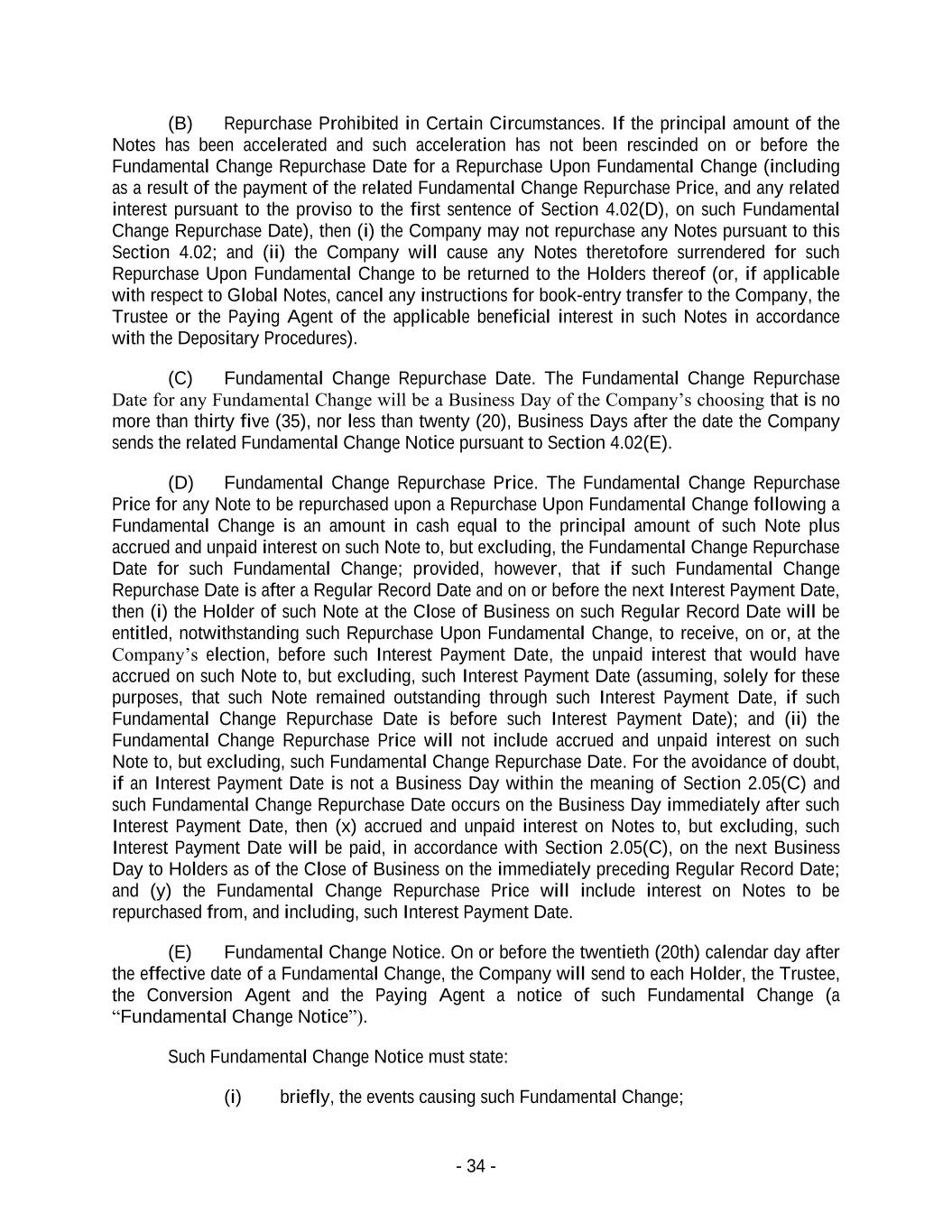 - 34 - (B) Repurchase Prohibited in Certain Circumstances. If the principal amount of the Notes has been accelerated and such acceleration has not been rescinded on or before the Fundamental Change Repurchase Date for a Repurchase Upon Fundamental Change (including as a result of the payment of the related Fundamental Change Repurchase Price, and any related interest pursuant to the proviso to the first sentence of Section 4.02(D), on such Fundamental Change Repurchase Date), then (i) the Company may not repurchase any Notes pursuant to this Section 4.02; and (ii) the Company will cause any Notes theretofore surrendered for such Repurchase Upon Fundamental Change to be returned to the Holders thereof (or, if applicable with respect to Global Notes, cancel any instructions for book-entry transfer to the Company, the Trustee or the Paying Agent of the applicable beneficial interest in such Notes in accordance with the Depositary Procedures). (C) Fundamental Change Repurchase Date. The Fundamental Change Repurchase Date for any Fundamental Change will be a Business Day of the Company’s choosing that is no more than thirty five (35), nor less than twenty (20), Business Days after the date the Company sends the related Fundamental Change Notice pursuant to Section 4.02(E). (D) Fundamental Change Repurchase Price. The Fundamental Change Repurchase Price for any Note to be repurchased upon a Repurchase Upon Fundamental Change following a Fundamental Change is an amount in cash equal to the principal amount of such Note plus accrued and unpaid interest on such Note to, but excluding, the Fundamental Change Repurchase Date for such Fundamental Change; provided, however, that if such Fundamental Change Repurchase Date is after a Regular Record Date and on or before the next Interest Payment Date, then (i) the Holder of such Note at the Close of Business on such Regular Record Date will be entitled, notwithstanding such Repurchase Upon Fundamental Change, to receive, on or, at the Company’s election, before such Interest Payment Date, the unpaid interest that would have accrued on such Note to, but excluding, such Interest Payment Date (assuming, solely for these purposes, that such Note remained outstanding through such Interest Payment Date, if such Fundamental Change Repurchase Date is before such Interest Payment Date); and (ii) the Fundamental Change Repurchase Price will not include accrued and unpaid interest on such Note to, but excluding, such Fundamental Change Repurchase Date. For the avoidance of doubt, if an Interest Payment Date is not a Business Day within the meaning of Section 2.05(C) and such Fundamental Change Repurchase Date occurs on the Business Day immediately after such Interest Payment Date, then (x) accrued and unpaid interest on Notes to, but excluding, such Interest Payment Date will be paid, in accordance with Section 2.05(C), on the next Business Day to Holders as of the Close of Business on the immediately preceding Regular Record Date; and (y) the Fundamental Change Repurchase Price will include interest on Notes to be repurchased from, and including, such Interest Payment Date. (E) Fundamental Change Notice. On or before the twentieth (20th) calendar day after the effective date of a Fundamental Change, the Company will send to each Holder, the Trustee, the Conversion Agent and the Paying Agent a notice of such Fundamental Change (a “Fundamental Change Notice”). Such Fundamental Change Notice must state: (i) briefly, the events causing such Fundamental Change;