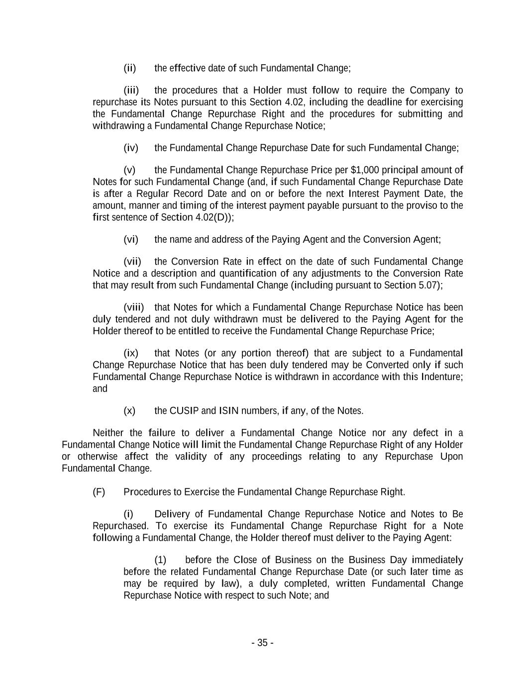 - 35 - (ii) the effective date of such Fundamental Change; (iii) the procedures that a Holder must follow to require the Company to repurchase its Notes pursuant to this Section 4.02, including the deadline for exercising the Fundamental Change Repurchase Right and the procedures for submitting and withdrawing a Fundamental Change Repurchase Notice; (iv) the Fundamental Change Repurchase Date for such Fundamental Change; (v) the Fundamental Change Repurchase Price per $1,000 principal amount of Notes for such Fundamental Change (and, if such Fundamental Change Repurchase Date is after a Regular Record Date and on or before the next Interest Payment Date, the amount, manner and timing of the interest payment payable pursuant to the proviso to the first sentence of Section 4.02(D)); (vi) the name and address of the Paying Agent and the Conversion Agent; (vii) the Conversion Rate in effect on the date of such Fundamental Change Notice and a description and quantification of any adjustments to the Conversion Rate that may result from such Fundamental Change (including pursuant to Section 5.07); (viii) that Notes for which a Fundamental Change Repurchase Notice has been duly tendered and not duly withdrawn must be delivered to the Paying Agent for the Holder thereof to be entitled to receive the Fundamental Change Repurchase Price; (ix) that Notes (or any portion thereof) that are subject to a Fundamental Change Repurchase Notice that has been duly tendered may be Converted only if such Fundamental Change Repurchase Notice is withdrawn in accordance with this Indenture; and (x) the CUSIP and ISIN numbers, if any, of the Notes. Neither the failure to deliver a Fundamental Change Notice nor any defect in a Fundamental Change Notice will limit the Fundamental Change Repurchase Right of any Holder or otherwise affect the validity of any proceedings relating to any Repurchase Upon Fundamental Change. (F) Procedures to Exercise the Fundamental Change Repurchase Right. (i) Delivery of Fundamental Change Repurchase Notice and Notes to Be Repurchased. To exercise its Fundamental Change Repurchase Right for a Note following a Fundamental Change, the Holder thereof must deliver to the Paying Agent: (1) before the Close of Business on the Business Day immediately before the related Fundamental Change Repurchase Date (or such later time as may be required by law), a duly completed, written Fundamental Change Repurchase Notice with respect to such Note; and