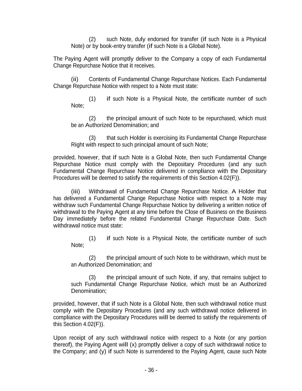 - 36 - (2) such Note, duly endorsed for transfer (if such Note is a Physical Note) or by book-entry transfer (if such Note is a Global Note). The Paying Agent will promptly deliver to the Company a copy of each Fundamental Change Repurchase Notice that it receives. (ii) Contents of Fundamental Change Repurchase Notices. Each Fundamental Change Repurchase Notice with respect to a Note must state: (1) if such Note is a Physical Note, the certificate number of such Note; (2) the principal amount of such Note to be repurchased, which must be an Authorized Denomination; and (3) that such Holder is exercising its Fundamental Change Repurchase Right with respect to such principal amount of such Note; provided, however, that if such Note is a Global Note, then such Fundamental Change Repurchase Notice must comply with the Depositary Procedures (and any such Fundamental Change Repurchase Notice delivered in compliance with the Depositary Procedures will be deemed to satisfy the requirements of this Section 4.02(F)). (iii) Withdrawal of Fundamental Change Repurchase Notice. A Holder that has delivered a Fundamental Change Repurchase Notice with respect to a Note may withdraw such Fundamental Change Repurchase Notice by delivering a written notice of withdrawal to the Paying Agent at any time before the Close of Business on the Business Day immediately before the related Fundamental Change Repurchase Date. Such withdrawal notice must state: (1) if such Note is a Physical Note, the certificate number of such Note; (2) the principal amount of such Note to be withdrawn, which must be an Authorized Denomination; and (3) the principal amount of such Note, if any, that remains subject to such Fundamental Change Repurchase Notice, which must be an Authorized Denomination; provided, however, that if such Note is a Global Note, then such withdrawal notice must comply with the Depositary Procedures (and any such withdrawal notice delivered in compliance with the Depositary Procedures will be deemed to satisfy the requirements of this Section 4.02(F)). Upon receipt of any such withdrawal notice with respect to a Note (or any portion thereof), the Paying Agent will (x) promptly deliver a copy of such withdrawal notice to the Company; and (y) if such Note is surrendered to the Paying Agent, cause such Note