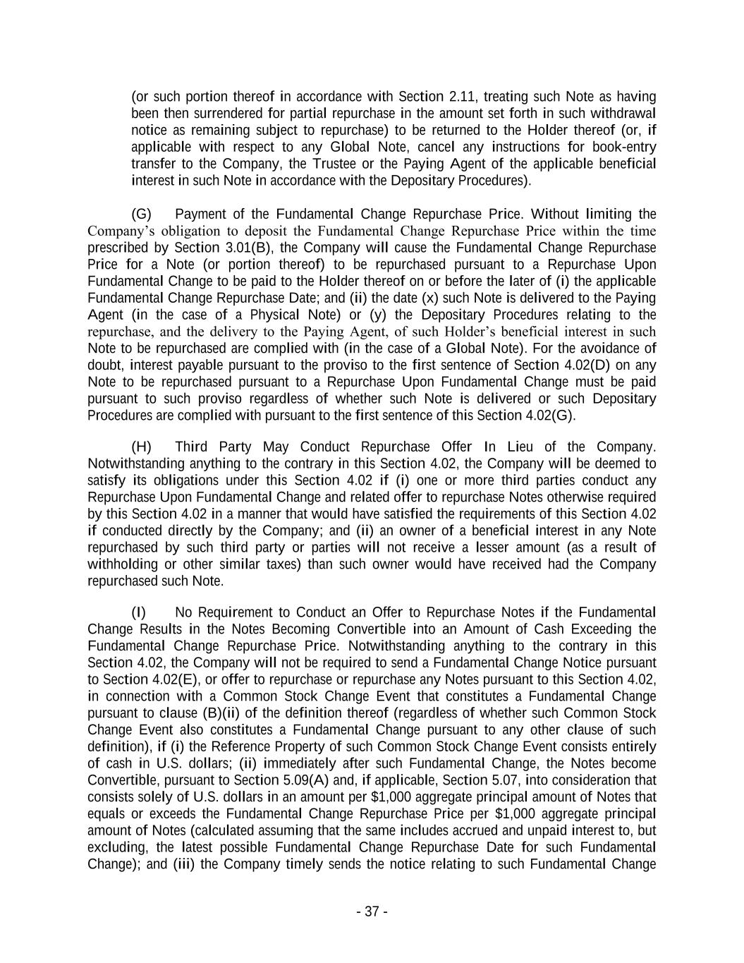 - 37 - (or such portion thereof in accordance with Section 2.11, treating such Note as having been then surrendered for partial repurchase in the amount set forth in such withdrawal notice as remaining subject to repurchase) to be returned to the Holder thereof (or, if applicable with respect to any Global Note, cancel any instructions for book-entry transfer to the Company, the Trustee or the Paying Agent of the applicable beneficial interest in such Note in accordance with the Depositary Procedures). (G) Payment of the Fundamental Change Repurchase Price. Without limiting the Company’s obligation to deposit the Fundamental Change Repurchase Price within the time prescribed by Section 3.01(B), the Company will cause the Fundamental Change Repurchase Price for a Note (or portion thereof) to be repurchased pursuant to a Repurchase Upon Fundamental Change to be paid to the Holder thereof on or before the later of (i) the applicable Fundamental Change Repurchase Date; and (ii) the date (x) such Note is delivered to the Paying Agent (in the case of a Physical Note) or (y) the Depositary Procedures relating to the repurchase, and the delivery to the Paying Agent, of such Holder’s beneficial interest in such Note to be repurchased are complied with (in the case of a Global Note). For the avoidance of doubt, interest payable pursuant to the proviso to the first sentence of Section 4.02(D) on any Note to be repurchased pursuant to a Repurchase Upon Fundamental Change must be paid pursuant to such proviso regardless of whether such Note is delivered or such Depositary Procedures are complied with pursuant to the first sentence of this Section 4.02(G). (H) Third Party May Conduct Repurchase Offer In Lieu of the Company. Notwithstanding anything to the contrary in this Section 4.02, the Company will be deemed to satisfy its obligations under this Section 4.02 if (i) one or more third parties conduct any Repurchase Upon Fundamental Change and related offer to repurchase Notes otherwise required by this Section 4.02 in a manner that would have satisfied the requirements of this Section 4.02 if conducted directly by the Company; and (ii) an owner of a beneficial interest in any Note repurchased by such third party or parties will not receive a lesser amount (as a result of withholding or other similar taxes) than such owner would have received had the Company repurchased such Note. (I) No Requirement to Conduct an Offer to Repurchase Notes if the Fundamental Change Results in the Notes Becoming Convertible into an Amount of Cash Exceeding the Fundamental Change Repurchase Price. Notwithstanding anything to the contrary in this Section 4.02, the Company will not be required to send a Fundamental Change Notice pursuant to Section 4.02(E), or offer to repurchase or repurchase any Notes pursuant to this Section 4.02, in connection with a Common Stock Change Event that constitutes a Fundamental Change pursuant to clause (B)(ii) of the definition thereof (regardless of whether such Common Stock Change Event also constitutes a Fundamental Change pursuant to any other clause of such definition), if (i) the Reference Property of such Common Stock Change Event consists entirely of cash in U.S. dollars; (ii) immediately after such Fundamental Change, the Notes become Convertible, pursuant to Section 5.09(A) and, if applicable, Section 5.07, into consideration that consists solely of U.S. dollars in an amount per $1,000 aggregate principal amount of Notes that equals or exceeds the Fundamental Change Repurchase Price per $1,000 aggregate principal amount of Notes (calculated assuming that the same includes accrued and unpaid interest to, but excluding, the latest possible Fundamental Change Repurchase Date for such Fundamental Change); and (iii) the Company timely sends the notice relating to such Fundamental Change
