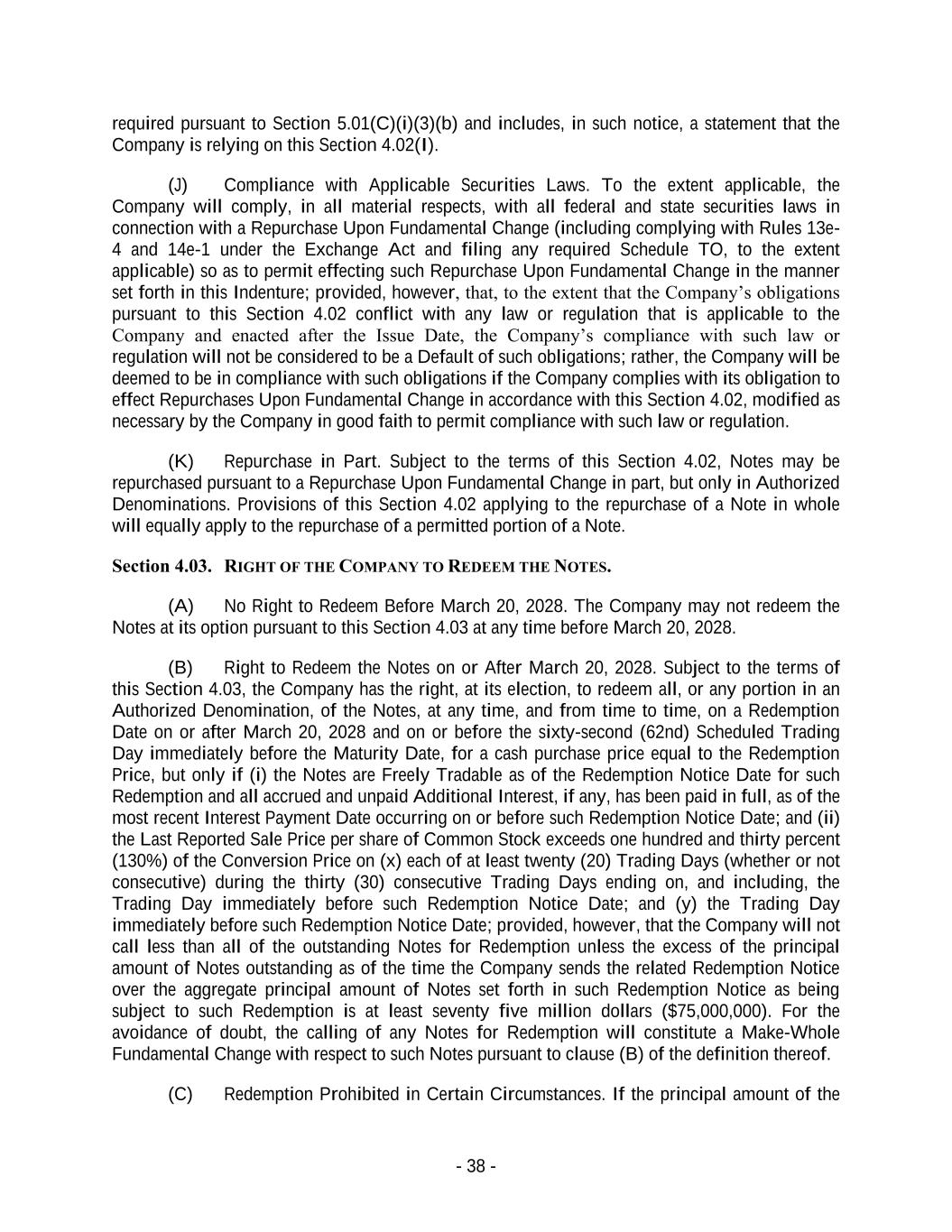 - 38 - required pursuant to Section 5.01(C)(i)(3)(b) and includes, in such notice, a statement that the Company is relying on this Section 4.02(I). (J) Compliance with Applicable Securities Laws. To the extent applicable, the Company will comply, in all material respects, with all federal and state securities laws in connection with a Repurchase Upon Fundamental Change (including complying with Rules 13e- 4 and 14e-1 under the Exchange Act and filing any required Schedule TO, to the extent applicable) so as to permit effecting such Repurchase Upon Fundamental Change in the manner set forth in this Indenture; provided, however, that, to the extent that the Company’s obligations pursuant to this Section 4.02 conflict with any law or regulation that is applicable to the Company and enacted after the Issue Date, the Company’s compliance with such law or regulation will not be considered to be a Default of such obligations; rather, the Company will be deemed to be in compliance with such obligations if the Company complies with its obligation to effect Repurchases Upon Fundamental Change in accordance with this Section 4.02, modified as necessary by the Company in good faith to permit compliance with such law or regulation. (K) Repurchase in Part. Subject to the terms of this Section 4.02, Notes may be repurchased pursuant to a Repurchase Upon Fundamental Change in part, but only in Authorized Denominations. Provisions of this Section 4.02 applying to the repurchase of a Note in whole will equally apply to the repurchase of a permitted portion of a Note. Section 4.03. RIGHT OF THE COMPANY TO REDEEM THE NOTES. (A) No Right to Redeem Before March 20, 2028. The Company may not redeem the Notes at its option pursuant to this Section 4.03 at any time before March 20, 2028. (B) Right to Redeem the Notes on or After March 20, 2028. Subject to the terms of this Section 4.03, the Company has the right, at its election, to redeem all, or any portion in an Authorized Denomination, of the Notes, at any time, and from time to time, on a Redemption Date on or after March 20, 2028 and on or before the sixty-second (62nd) Scheduled Trading Day immediately before the Maturity Date, for a cash purchase price equal to the Redemption Price, but only if (i) the Notes are Freely Tradable as of the Redemption Notice Date for such Redemption and all accrued and unpaid Additional Interest, if any, has been paid in full, as of the most recent Interest Payment Date occurring on or before such Redemption Notice Date; and (ii) the Last Reported Sale Price per share of Common Stock exceeds one hundred and thirty percent (130%) of the Conversion Price on (x) each of at least twenty (20) Trading Days (whether or not consecutive) during the thirty (30) consecutive Trading Days ending on, and including, the Trading Day immediately before such Redemption Notice Date; and (y) the Trading Day immediately before such Redemption Notice Date; provided, however, that the Company will not call less than all of the outstanding Notes for Redemption unless the excess of the principal amount of Notes outstanding as of the time the Company sends the related Redemption Notice over the aggregate principal amount of Notes set forth in such Redemption Notice as being subject to such Redemption is at least seventy five million dollars ($75,000,000). For the avoidance of doubt, the calling of any Notes for Redemption will constitute a Make-Whole Fundamental Change with respect to such Notes pursuant to clause (B) of the definition thereof. (C) Redemption Prohibited in Certain Circumstances. If the principal amount of the