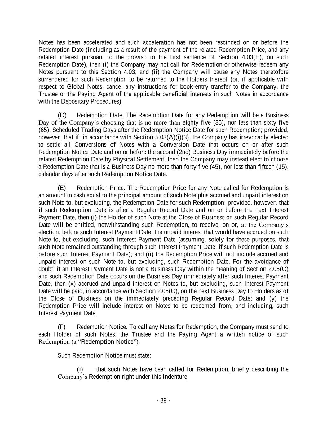 - 39 - Notes has been accelerated and such acceleration has not been rescinded on or before the Redemption Date (including as a result of the payment of the related Redemption Price, and any related interest pursuant to the proviso to the first sentence of Section 4.03(E), on such Redemption Date), then (i) the Company may not call for Redemption or otherwise redeem any Notes pursuant to this Section 4.03; and (ii) the Company will cause any Notes theretofore surrendered for such Redemption to be returned to the Holders thereof (or, if applicable with respect to Global Notes, cancel any instructions for book-entry transfer to the Company, the Trustee or the Paying Agent of the applicable beneficial interests in such Notes in accordance with the Depositary Procedures). (D) Redemption Date. The Redemption Date for any Redemption will be a Business Day of the Company’s choosing that is no more than eighty five (85), nor less than sixty five (65), Scheduled Trading Days after the Redemption Notice Date for such Redemption; provided, however, that if, in accordance with Section 5.03(A)(i)(3), the Company has irrevocably elected to settle all Conversions of Notes with a Conversion Date that occurs on or after such Redemption Notice Date and on or before the second (2nd) Business Day immediately before the related Redemption Date by Physical Settlement, then the Company may instead elect to choose a Redemption Date that is a Business Day no more than forty five (45), nor less than fifteen (15), calendar days after such Redemption Notice Date. (E) Redemption Price. The Redemption Price for any Note called for Redemption is an amount in cash equal to the principal amount of such Note plus accrued and unpaid interest on such Note to, but excluding, the Redemption Date for such Redemption; provided, however, that if such Redemption Date is after a Regular Record Date and on or before the next Interest Payment Date, then (i) the Holder of such Note at the Close of Business on such Regular Record Date will be entitled, notwithstanding such Redemption, to receive, on or, at the Company’s election, before such Interest Payment Date, the unpaid interest that would have accrued on such Note to, but excluding, such Interest Payment Date (assuming, solely for these purposes, that such Note remained outstanding through such Interest Payment Date, if such Redemption Date is before such Interest Payment Date); and (ii) the Redemption Price will not include accrued and unpaid interest on such Note to, but excluding, such Redemption Date. For the avoidance of doubt, if an Interest Payment Date is not a Business Day within the meaning of Section 2.05(C) and such Redemption Date occurs on the Business Day immediately after such Interest Payment Date, then (x) accrued and unpaid interest on Notes to, but excluding, such Interest Payment Date will be paid, in accordance with Section 2.05(C), on the next Business Day to Holders as of the Close of Business on the immediately preceding Regular Record Date; and (y) the Redemption Price will include interest on Notes to be redeemed from, and including, such Interest Payment Date. (F) Redemption Notice. To call any Notes for Redemption, the Company must send to each Holder of such Notes, the Trustee and the Paying Agent a written notice of such Redemption (a “Redemption Notice”). Such Redemption Notice must state: (i) that such Notes have been called for Redemption, briefly describing the Company’s Redemption right under this Indenture;