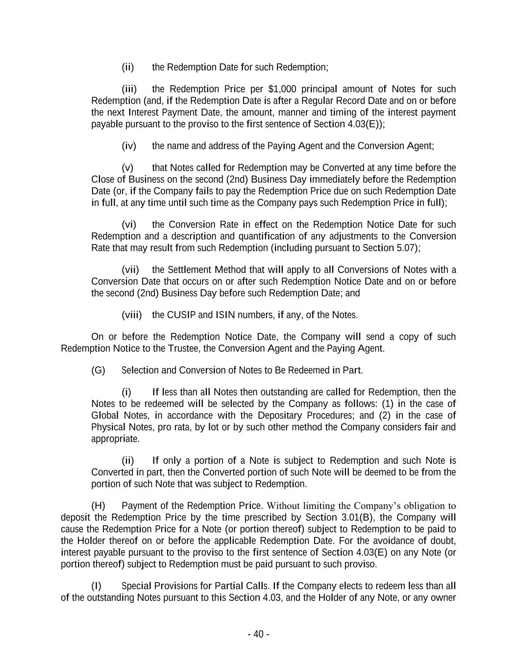 - 40 - (ii) the Redemption Date for such Redemption; (iii) the Redemption Price per $1,000 principal amount of Notes for such Redemption (and, if the Redemption Date is after a Regular Record Date and on or before the next Interest Payment Date, the amount, manner and timing of the interest payment payable pursuant to the proviso to the first sentence of Section 4.03(E)); (iv) the name and address of the Paying Agent and the Conversion Agent; (v) that Notes called for Redemption may be Converted at any time before the Close of Business on the second (2nd) Business Day immediately before the Redemption Date (or, if the Company fails to pay the Redemption Price due on such Redemption Date in full, at any time until such time as the Company pays such Redemption Price in full); (vi) the Conversion Rate in effect on the Redemption Notice Date for such Redemption and a description and quantification of any adjustments to the Conversion Rate that may result from such Redemption (including pursuant to Section 5.07); (vii) the Settlement Method that will apply to all Conversions of Notes with a Conversion Date that occurs on or after such Redemption Notice Date and on or before the second (2nd) Business Day before such Redemption Date; and (viii) the CUSIP and ISIN numbers, if any, of the Notes. On or before the Redemption Notice Date, the Company will send a copy of such Redemption Notice to the Trustee, the Conversion Agent and the Paying Agent. (G) Selection and Conversion of Notes to Be Redeemed in Part. (i) If less than all Notes then outstanding are called for Redemption, then the Notes to be redeemed will be selected by the Company as follows: (1) in the case of Global Notes, in accordance with the Depositary Procedures; and (2) in the case of Physical Notes, pro rata, by lot or by such other method the Company considers fair and appropriate. (ii) If only a portion of a Note is subject to Redemption and such Note is Converted in part, then the Converted portion of such Note will be deemed to be from the portion of such Note that was subject to Redemption. (H) Payment of the Redemption Price. Without limiting the Company’s obligation to deposit the Redemption Price by the time prescribed by Section 3.01(B), the Company will cause the Redemption Price for a Note (or portion thereof) subject to Redemption to be paid to the Holder thereof on or before the applicable Redemption Date. For the avoidance of doubt, interest payable pursuant to the proviso to the first sentence of Section 4.03(E) on any Note (or portion thereof) subject to Redemption must be paid pursuant to such proviso. (I) Special Provisions for Partial Calls. If the Company elects to redeem less than all of the outstanding Notes pursuant to this Section 4.03, and the Holder of any Note, or any owner