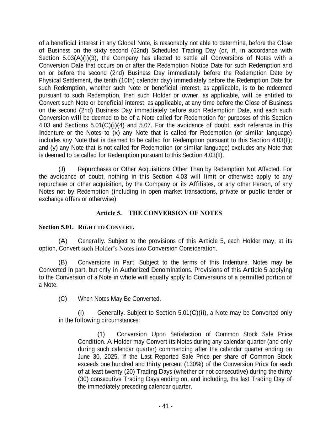 - 41 - of a beneficial interest in any Global Note, is reasonably not able to determine, before the Close of Business on the sixty second (62nd) Scheduled Trading Day (or, if, in accordance with Section 5.03(A)(i)(3), the Company has elected to settle all Conversions of Notes with a Conversion Date that occurs on or after the Redemption Notice Date for such Redemption and on or before the second (2nd) Business Day immediately before the Redemption Date by Physical Settlement, the tenth (10th) calendar day) immediately before the Redemption Date for such Redemption, whether such Note or beneficial interest, as applicable, is to be redeemed pursuant to such Redemption, then such Holder or owner, as applicable, will be entitled to Convert such Note or beneficial interest, as applicable, at any time before the Close of Business on the second (2nd) Business Day immediately before such Redemption Date, and each such Conversion will be deemed to be of a Note called for Redemption for purposes of this Section 4.03 and Sections 5.01(C)(i)(4) and 5.07. For the avoidance of doubt, each reference in this Indenture or the Notes to (x) any Note that is called for Redemption (or similar language) includes any Note that is deemed to be called for Redemption pursuant to this Section 4.03(I); and (y) any Note that is not called for Redemption (or similar language) excludes any Note that is deemed to be called for Redemption pursuant to this Section 4.03(I). (J) Repurchases or Other Acquisitions Other Than by Redemption Not Affected. For the avoidance of doubt, nothing in this Section 4.03 will limit or otherwise apply to any repurchase or other acquisition, by the Company or its Affiliates, or any other Person, of any Notes not by Redemption (including in open market transactions, private or public tender or exchange offers or otherwise). Article 5. THE CONVERSION OF NOTES Section 5.01. RIGHT TO CONVERT. (A) Generally. Subject to the provisions of this Article 5, each Holder may, at its option, Convert such Holder’s Notes into Conversion Consideration. (B) Conversions in Part. Subject to the terms of this Indenture, Notes may be Converted in part, but only in Authorized Denominations. Provisions of this Article 5 applying to the Conversion of a Note in whole will equally apply to Conversions of a permitted portion of a Note. (C) When Notes May Be Converted. (i) Generally. Subject to Section 5.01(C)(ii), a Note may be Converted only in the following circumstances: (1) Conversion Upon Satisfaction of Common Stock Sale Price Condition. A Holder may Convert its Notes during any calendar quarter (and only during such calendar quarter) commencing after the calendar quarter ending on June 30, 2025, if the Last Reported Sale Price per share of Common Stock exceeds one hundred and thirty percent (130%) of the Conversion Price for each of at least twenty (20) Trading Days (whether or not consecutive) during the thirty (30) consecutive Trading Days ending on, and including, the last Trading Day of the immediately preceding calendar quarter.