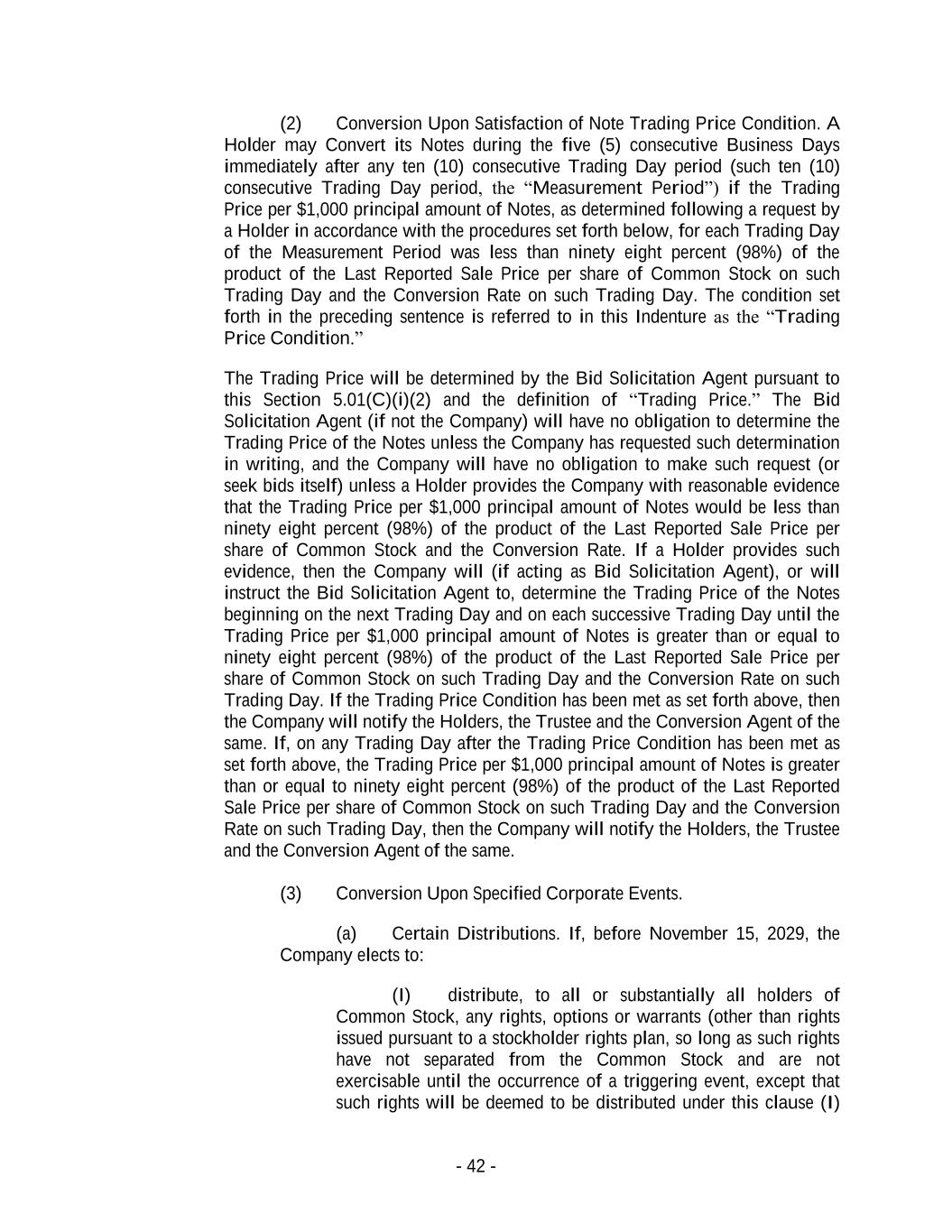 - 42 - (2) Conversion Upon Satisfaction of Note Trading Price Condition. A Holder may Convert its Notes during the five (5) consecutive Business Days immediately after any ten (10) consecutive Trading Day period (such ten (10) consecutive Trading Day period, the “Measurement Period”) if the Trading Price per $1,000 principal amount of Notes, as determined following a request by a Holder in accordance with the procedures set forth below, for each Trading Day of the Measurement Period was less than ninety eight percent (98%) of the product of the Last Reported Sale Price per share of Common Stock on such Trading Day and the Conversion Rate on such Trading Day. The condition set forth in the preceding sentence is referred to in this Indenture as the “Trading Price Condition.” The Trading Price will be determined by the Bid Solicitation Agent pursuant to this Section 5.01(C)(i)(2) and the definition of “Trading Price.” The Bid Solicitation Agent (if not the Company) will have no obligation to determine the Trading Price of the Notes unless the Company has requested such determination in writing, and the Company will have no obligation to make such request (or seek bids itself) unless a Holder provides the Company with reasonable evidence that the Trading Price per $1,000 principal amount of Notes would be less than ninety eight percent (98%) of the product of the Last Reported Sale Price per share of Common Stock and the Conversion Rate. If a Holder provides such evidence, then the Company will (if acting as Bid Solicitation Agent), or will instruct the Bid Solicitation Agent to, determine the Trading Price of the Notes beginning on the next Trading Day and on each successive Trading Day until the Trading Price per $1,000 principal amount of Notes is greater than or equal to ninety eight percent (98%) of the product of the Last Reported Sale Price per share of Common Stock on such Trading Day and the Conversion Rate on such Trading Day. If the Trading Price Condition has been met as set forth above, then the Company will notify the Holders, the Trustee and the Conversion Agent of the same. If, on any Trading Day after the Trading Price Condition has been met as set forth above, the Trading Price per $1,000 principal amount of Notes is greater than or equal to ninety eight percent (98%) of the product of the Last Reported Sale Price per share of Common Stock on such Trading Day and the Conversion Rate on such Trading Day, then the Company will notify the Holders, the Trustee and the Conversion Agent of the same. (3) Conversion Upon Specified Corporate Events. (a) Certain Distributions. If, before November 15, 2029, the Company elects to: (I) distribute, to all or substantially all holders of Common Stock, any rights, options or warrants (other than rights issued pursuant to a stockholder rights plan, so long as such rights have not separated from the Common Stock and are not exercisable until the occurrence of a triggering event, except that such rights will be deemed to be distributed under this clause (I)