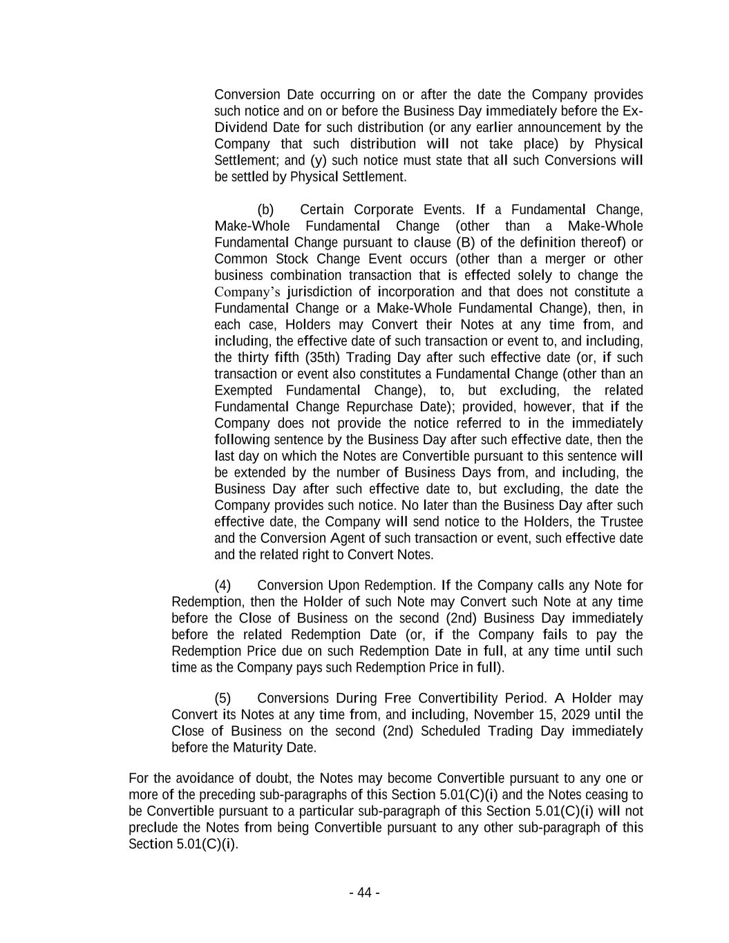 - 44 - Conversion Date occurring on or after the date the Company provides such notice and on or before the Business Day immediately before the Ex- Dividend Date for such distribution (or any earlier announcement by the Company that such distribution will not take place) by Physical Settlement; and (y) such notice must state that all such Conversions will be settled by Physical Settlement. (b) Certain Corporate Events. If a Fundamental Change, Make-Whole Fundamental Change (other than a Make-Whole Fundamental Change pursuant to clause (B) of the definition thereof) or Common Stock Change Event occurs (other than a merger or other business combination transaction that is effected solely to change the Company’s jurisdiction of incorporation and that does not constitute a Fundamental Change or a Make-Whole Fundamental Change), then, in each case, Holders may Convert their Notes at any time from, and including, the effective date of such transaction or event to, and including, the thirty fifth (35th) Trading Day after such effective date (or, if such transaction or event also constitutes a Fundamental Change (other than an Exempted Fundamental Change), to, but excluding, the related Fundamental Change Repurchase Date); provided, however, that if the Company does not provide the notice referred to in the immediately following sentence by the Business Day after such effective date, then the last day on which the Notes are Convertible pursuant to this sentence will be extended by the number of Business Days from, and including, the Business Day after such effective date to, but excluding, the date the Company provides such notice. No later than the Business Day after such effective date, the Company will send notice to the Holders, the Trustee and the Conversion Agent of such transaction or event, such effective date and the related right to Convert Notes. (4) Conversion Upon Redemption. If the Company calls any Note for Redemption, then the Holder of such Note may Convert such Note at any time before the Close of Business on the second (2nd) Business Day immediately before the related Redemption Date (or, if the Company fails to pay the Redemption Price due on such Redemption Date in full, at any time until such time as the Company pays such Redemption Price in full). (5) Conversions During Free Convertibility Period. A Holder may Convert its Notes at any time from, and including, November 15, 2029 until the Close of Business on the second (2nd) Scheduled Trading Day immediately before the Maturity Date. For the avoidance of doubt, the Notes may become Convertible pursuant to any one or more of the preceding sub-paragraphs of this Section 5.01(C)(i) and the Notes ceasing to be Convertible pursuant to a particular sub-paragraph of this Section 5.01(C)(i) will not preclude the Notes from being Convertible pursuant to any other sub-paragraph of this Section 5.01(C)(i).