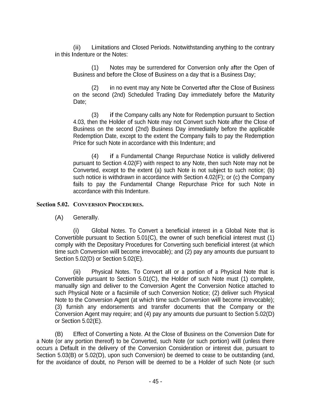 - 45 - (ii) Limitations and Closed Periods. Notwithstanding anything to the contrary in this Indenture or the Notes: (1) Notes may be surrendered for Conversion only after the Open of Business and before the Close of Business on a day that is a Business Day; (2) in no event may any Note be Converted after the Close of Business on the second (2nd) Scheduled Trading Day immediately before the Maturity Date; (3) if the Company calls any Note for Redemption pursuant to Section 4.03, then the Holder of such Note may not Convert such Note after the Close of Business on the second (2nd) Business Day immediately before the applicable Redemption Date, except to the extent the Company fails to pay the Redemption Price for such Note in accordance with this Indenture; and (4) if a Fundamental Change Repurchase Notice is validly delivered pursuant to Section 4.02(F) with respect to any Note, then such Note may not be Converted, except to the extent (a) such Note is not subject to such notice; (b) such notice is withdrawn in accordance with Section 4.02(F); or (c) the Company fails to pay the Fundamental Change Repurchase Price for such Note in accordance with this Indenture. Section 5.02. CONVERSION PROCEDURES. (A) Generally. (i) Global Notes. To Convert a beneficial interest in a Global Note that is Convertible pursuant to Section 5.01(C), the owner of such beneficial interest must (1) comply with the Depositary Procedures for Converting such beneficial interest (at which time such Conversion will become irrevocable); and (2) pay any amounts due pursuant to Section 5.02(D) or Section 5.02(E). (ii) Physical Notes. To Convert all or a portion of a Physical Note that is Convertible pursuant to Section 5.01(C), the Holder of such Note must (1) complete, manually sign and deliver to the Conversion Agent the Conversion Notice attached to such Physical Note or a facsimile of such Conversion Notice; (2) deliver such Physical Note to the Conversion Agent (at which time such Conversion will become irrevocable); (3) furnish any endorsements and transfer documents that the Company or the Conversion Agent may require; and (4) pay any amounts due pursuant to Section 5.02(D) or Section 5.02(E). (B) Effect of Converting a Note. At the Close of Business on the Conversion Date for a Note (or any portion thereof) to be Converted, such Note (or such portion) will (unless there occurs a Default in the delivery of the Conversion Consideration or interest due, pursuant to Section 5.03(B) or 5.02(D), upon such Conversion) be deemed to cease to be outstanding (and, for the avoidance of doubt, no Person will be deemed to be a Holder of such Note (or such