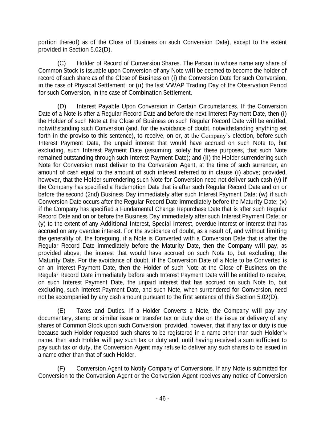 - 46 - portion thereof) as of the Close of Business on such Conversion Date), except to the extent provided in Section 5.02(D). (C) Holder of Record of Conversion Shares. The Person in whose name any share of Common Stock is issuable upon Conversion of any Note will be deemed to become the holder of record of such share as of the Close of Business on (i) the Conversion Date for such Conversion, in the case of Physical Settlement; or (ii) the last VWAP Trading Day of the Observation Period for such Conversion, in the case of Combination Settlement. (D) Interest Payable Upon Conversion in Certain Circumstances. If the Conversion Date of a Note is after a Regular Record Date and before the next Interest Payment Date, then (i) the Holder of such Note at the Close of Business on such Regular Record Date will be entitled, notwithstanding such Conversion (and, for the avoidance of doubt, notwithstanding anything set forth in the proviso to this sentence), to receive, on or, at the Company’s election, before such Interest Payment Date, the unpaid interest that would have accrued on such Note to, but excluding, such Interest Payment Date (assuming, solely for these purposes, that such Note remained outstanding through such Interest Payment Date); and (ii) the Holder surrendering such Note for Conversion must deliver to the Conversion Agent, at the time of such surrender, an amount of cash equal to the amount of such interest referred to in clause (i) above; provided, however, that the Holder surrendering such Note for Conversion need not deliver such cash (v) if the Company has specified a Redemption Date that is after such Regular Record Date and on or before the second (2nd) Business Day immediately after such Interest Payment Date; (w) if such Conversion Date occurs after the Regular Record Date immediately before the Maturity Date; (x) if the Company has specified a Fundamental Change Repurchase Date that is after such Regular Record Date and on or before the Business Day immediately after such Interest Payment Date; or (y) to the extent of any Additional Interest, Special Interest, overdue interest or interest that has accrued on any overdue interest. For the avoidance of doubt, as a result of, and without limiting the generality of, the foregoing, if a Note is Converted with a Conversion Date that is after the Regular Record Date immediately before the Maturity Date, then the Company will pay, as provided above, the interest that would have accrued on such Note to, but excluding, the Maturity Date. For the avoidance of doubt, if the Conversion Date of a Note to be Converted is on an Interest Payment Date, then the Holder of such Note at the Close of Business on the Regular Record Date immediately before such Interest Payment Date will be entitled to receive, on such Interest Payment Date, the unpaid interest that has accrued on such Note to, but excluding, such Interest Payment Date, and such Note, when surrendered for Conversion, need not be accompanied by any cash amount pursuant to the first sentence of this Section 5.02(D). (E) Taxes and Duties. If a Holder Converts a Note, the Company will pay any documentary, stamp or similar issue or transfer tax or duty due on the issue or delivery of any shares of Common Stock upon such Conversion; provided, however, that if any tax or duty is due because such Holder requested such shares to be registered in a name other than such Holder’s name, then such Holder will pay such tax or duty and, until having received a sum sufficient to pay such tax or duty, the Conversion Agent may refuse to deliver any such shares to be issued in a name other than that of such Holder. (F) Conversion Agent to Notify Company of Conversions. If any Note is submitted for Conversion to the Conversion Agent or the Conversion Agent receives any notice of Conversion