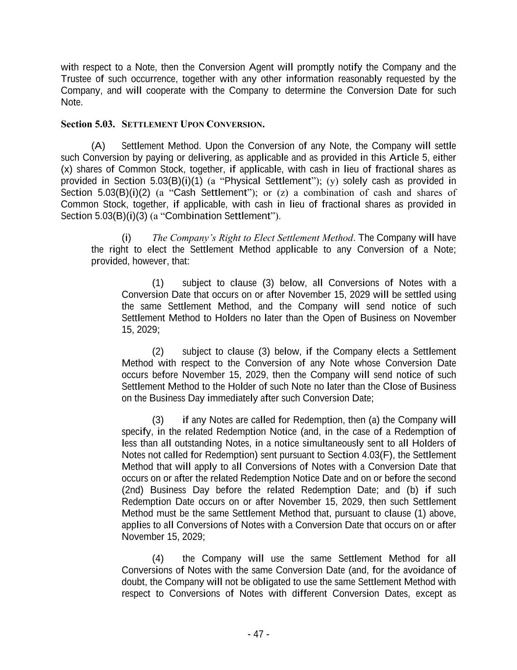 - 47 - with respect to a Note, then the Conversion Agent will promptly notify the Company and the Trustee of such occurrence, together with any other information reasonably requested by the Company, and will cooperate with the Company to determine the Conversion Date for such Note. Section 5.03. SETTLEMENT UPON CONVERSION. (A) Settlement Method. Upon the Conversion of any Note, the Company will settle such Conversion by paying or delivering, as applicable and as provided in this Article 5, either (x) shares of Common Stock, together, if applicable, with cash in lieu of fractional shares as provided in Section 5.03(B)(i)(1) (a “Physical Settlement”); (y) solely cash as provided in Section 5.03(B)(i)(2) (a “Cash Settlement”); or (z) a combination of cash and shares of Common Stock, together, if applicable, with cash in lieu of fractional shares as provided in Section 5.03(B)(i)(3) (a “Combination Settlement”). (i) The Company’s Right to Elect Settlement Method. The Company will have the right to elect the Settlement Method applicable to any Conversion of a Note; provided, however, that: (1) subject to clause (3) below, all Conversions of Notes with a Conversion Date that occurs on or after November 15, 2029 will be settled using the same Settlement Method, and the Company will send notice of such Settlement Method to Holders no later than the Open of Business on November 15, 2029; (2) subject to clause (3) below, if the Company elects a Settlement Method with respect to the Conversion of any Note whose Conversion Date occurs before November 15, 2029, then the Company will send notice of such Settlement Method to the Holder of such Note no later than the Close of Business on the Business Day immediately after such Conversion Date; (3) if any Notes are called for Redemption, then (a) the Company will specify, in the related Redemption Notice (and, in the case of a Redemption of less than all outstanding Notes, in a notice simultaneously sent to all Holders of Notes not called for Redemption) sent pursuant to Section 4.03(F), the Settlement Method that will apply to all Conversions of Notes with a Conversion Date that occurs on or after the related Redemption Notice Date and on or before the second (2nd) Business Day before the related Redemption Date; and (b) if such Redemption Date occurs on or after November 15, 2029, then such Settlement Method must be the same Settlement Method that, pursuant to clause (1) above, applies to all Conversions of Notes with a Conversion Date that occurs on or after November 15, 2029; (4) the Company will use the same Settlement Method for all Conversions of Notes with the same Conversion Date (and, for the avoidance of doubt, the Company will not be obligated to use the same Settlement Method with respect to Conversions of Notes with different Conversion Dates, except as