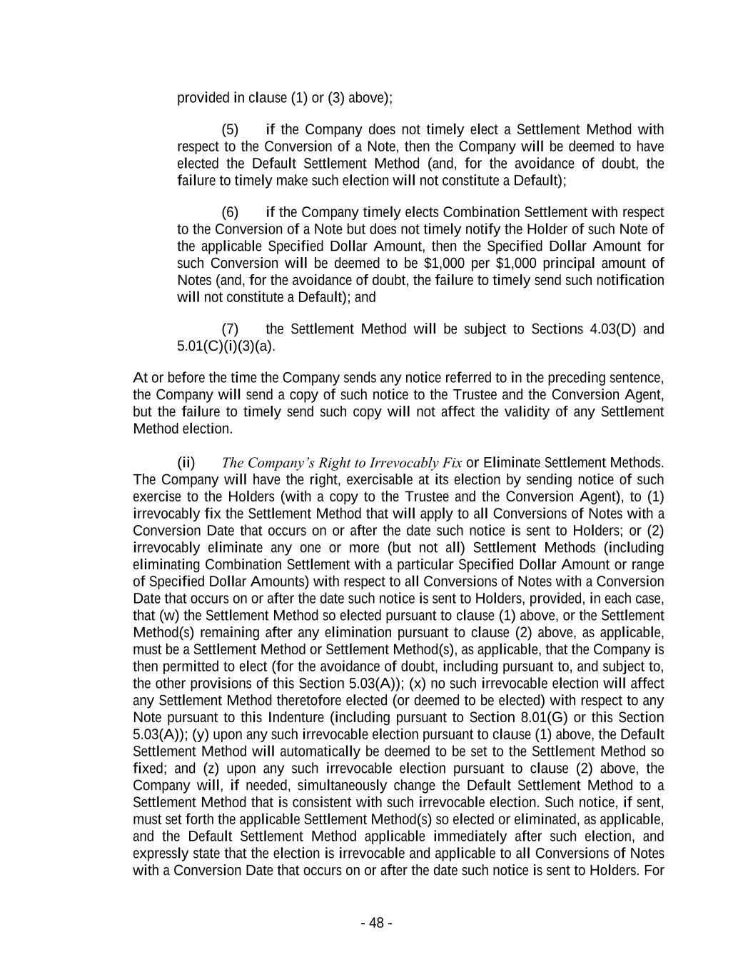 - 48 - provided in clause (1) or (3) above); (5) if the Company does not timely elect a Settlement Method with respect to the Conversion of a Note, then the Company will be deemed to have elected the Default Settlement Method (and, for the avoidance of doubt, the failure to timely make such election will not constitute a Default); (6) if the Company timely elects Combination Settlement with respect to the Conversion of a Note but does not timely notify the Holder of such Note of the applicable Specified Dollar Amount, then the Specified Dollar Amount for such Conversion will be deemed to be $1,000 per $1,000 principal amount of Notes (and, for the avoidance of doubt, the failure to timely send such notification will not constitute a Default); and (7) the Settlement Method will be subject to Sections 4.03(D) and 5.01(C)(i)(3)(a). At or before the time the Company sends any notice referred to in the preceding sentence, the Company will send a copy of such notice to the Trustee and the Conversion Agent, but the failure to timely send such copy will not affect the validity of any Settlement Method election. (ii) The Company’s Right to Irrevocably Fix or Eliminate Settlement Methods. The Company will have the right, exercisable at its election by sending notice of such exercise to the Holders (with a copy to the Trustee and the Conversion Agent), to (1) irrevocably fix the Settlement Method that will apply to all Conversions of Notes with a Conversion Date that occurs on or after the date such notice is sent to Holders; or (2) irrevocably eliminate any one or more (but not all) Settlement Methods (including eliminating Combination Settlement with a particular Specified Dollar Amount or range of Specified Dollar Amounts) with respect to all Conversions of Notes with a Conversion Date that occurs on or after the date such notice is sent to Holders, provided, in each case, that (w) the Settlement Method so elected pursuant to clause (1) above, or the Settlement Method(s) remaining after any elimination pursuant to clause (2) above, as applicable, must be a Settlement Method or Settlement Method(s), as applicable, that the Company is then permitted to elect (for the avoidance of doubt, including pursuant to, and subject to, the other provisions of this Section 5.03(A)); (x) no such irrevocable election will affect any Settlement Method theretofore elected (or deemed to be elected) with respect to any Note pursuant to this Indenture (including pursuant to Section 8.01(G) or this Section 5.03(A)); (y) upon any such irrevocable election pursuant to clause (1) above, the Default Settlement Method will automatically be deemed to be set to the Settlement Method so fixed; and (z) upon any such irrevocable election pursuant to clause (2) above, the Company will, if needed, simultaneously change the Default Settlement Method to a Settlement Method that is consistent with such irrevocable election. Such notice, if sent, must set forth the applicable Settlement Method(s) so elected or eliminated, as applicable, and the Default Settlement Method applicable immediately after such election, and expressly state that the election is irrevocable and applicable to all Conversions of Notes with a Conversion Date that occurs on or after the date such notice is sent to Holders. For