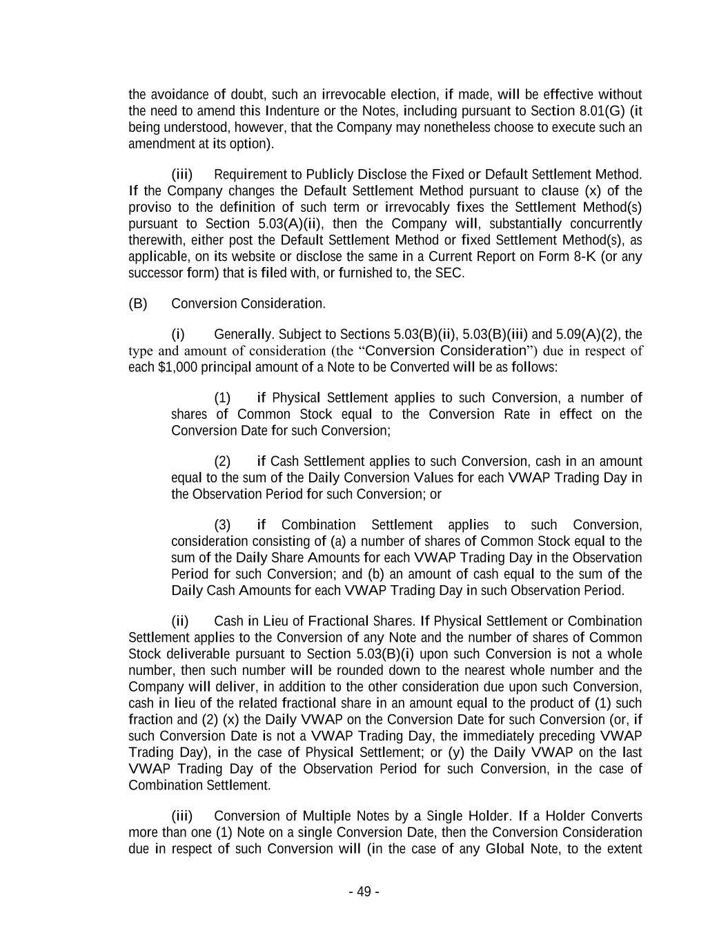 - 49 - the avoidance of doubt, such an irrevocable election, if made, will be effective without the need to amend this Indenture or the Notes, including pursuant to Section 8.01(G) (it being understood, however, that the Company may nonetheless choose to execute such an amendment at its option). (iii) Requirement to Publicly Disclose the Fixed or Default Settlement Method. If the Company changes the Default Settlement Method pursuant to clause (x) of the proviso to the definition of such term or irrevocably fixes the Settlement Method(s) pursuant to Section 5.03(A)(ii), then the Company will, substantially concurrently therewith, either post the Default Settlement Method or fixed Settlement Method(s), as applicable, on its website or disclose the same in a Current Report on Form 8-K (or any successor form) that is filed with, or furnished to, the SEC. (B) Conversion Consideration. (i) Generally. Subject to Sections 5.03(B)(ii), 5.03(B)(iii) and 5.09(A)(2), the type and amount of consideration (the “Conversion Consideration”) due in respect of each $1,000 principal amount of a Note to be Converted will be as follows: (1) if Physical Settlement applies to such Conversion, a number of shares of Common Stock equal to the Conversion Rate in effect on the Conversion Date for such Conversion; (2) if Cash Settlement applies to such Conversion, cash in an amount equal to the sum of the Daily Conversion Values for each VWAP Trading Day in the Observation Period for such Conversion; or (3) if Combination Settlement applies to such Conversion, consideration consisting of (a) a number of shares of Common Stock equal to the sum of the Daily Share Amounts for each VWAP Trading Day in the Observation Period for such Conversion; and (b) an amount of cash equal to the sum of the Daily Cash Amounts for each VWAP Trading Day in such Observation Period. (ii) Cash in Lieu of Fractional Shares. If Physical Settlement or Combination Settlement applies to the Conversion of any Note and the number of shares of Common Stock deliverable pursuant to Section 5.03(B)(i) upon such Conversion is not a whole number, then such number will be rounded down to the nearest whole number and the Company will deliver, in addition to the other consideration due upon such Conversion, cash in lieu of the related fractional share in an amount equal to the product of (1) such fraction and (2) (x) the Daily VWAP on the Conversion Date for such Conversion (or, if such Conversion Date is not a VWAP Trading Day, the immediately preceding VWAP Trading Day), in the case of Physical Settlement; or (y) the Daily VWAP on the last VWAP Trading Day of the Observation Period for such Conversion, in the case of Combination Settlement. (iii) Conversion of Multiple Notes by a Single Holder. If a Holder Converts more than one (1) Note on a single Conversion Date, then the Conversion Consideration due in respect of such Conversion will (in the case of any Global Note, to the extent