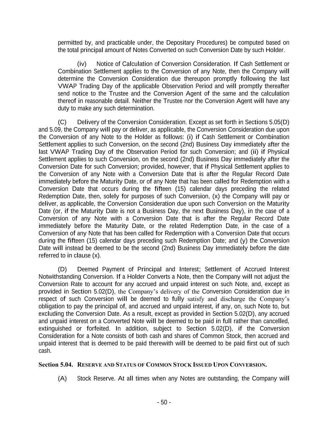 - 50 - permitted by, and practicable under, the Depositary Procedures) be computed based on the total principal amount of Notes Converted on such Conversion Date by such Holder. (iv) Notice of Calculation of Conversion Consideration. If Cash Settlement or Combination Settlement applies to the Conversion of any Note, then the Company will determine the Conversion Consideration due thereupon promptly following the last VWAP Trading Day of the applicable Observation Period and will promptly thereafter send notice to the Trustee and the Conversion Agent of the same and the calculation thereof in reasonable detail. Neither the Trustee nor the Conversion Agent will have any duty to make any such determination. (C) Delivery of the Conversion Consideration. Except as set forth in Sections 5.05(D) and 5.09, the Company will pay or deliver, as applicable, the Conversion Consideration due upon the Conversion of any Note to the Holder as follows: (i) if Cash Settlement or Combination Settlement applies to such Conversion, on the second (2nd) Business Day immediately after the last VWAP Trading Day of the Observation Period for such Conversion; and (ii) if Physical Settlement applies to such Conversion, on the second (2nd) Business Day immediately after the Conversion Date for such Conversion; provided, however, that if Physical Settlement applies to the Conversion of any Note with a Conversion Date that is after the Regular Record Date immediately before the Maturity Date, or of any Note that has been called for Redemption with a Conversion Date that occurs during the fifteen (15) calendar days preceding the related Redemption Date, then, solely for purposes of such Conversion, (x) the Company will pay or deliver, as applicable, the Conversion Consideration due upon such Conversion on the Maturity Date (or, if the Maturity Date is not a Business Day, the next Business Day), in the case of a Conversion of any Note with a Conversion Date that is after the Regular Record Date immediately before the Maturity Date, or the related Redemption Date, in the case of a Conversion of any Note that has been called for Redemption with a Conversion Date that occurs during the fifteen (15) calendar days preceding such Redemption Date; and (y) the Conversion Date will instead be deemed to be the second (2nd) Business Day immediately before the date referred to in clause (x). (D) Deemed Payment of Principal and Interest; Settlement of Accrued Interest Notwithstanding Conversion. If a Holder Converts a Note, then the Company will not adjust the Conversion Rate to account for any accrued and unpaid interest on such Note, and, except as provided in Section 5.02(D), the Company’s delivery of the Conversion Consideration due in respect of such Conversion will be deemed to fully satisfy and discharge the Company’s obligation to pay the principal of, and accrued and unpaid interest, if any, on, such Note to, but excluding the Conversion Date. As a result, except as provided in Section 5.02(D), any accrued and unpaid interest on a Converted Note will be deemed to be paid in full rather than cancelled, extinguished or forfeited. In addition, subject to Section 5.02(D), if the Conversion Consideration for a Note consists of both cash and shares of Common Stock, then accrued and unpaid interest that is deemed to be paid therewith will be deemed to be paid first out of such cash. Section 5.04. RESERVE AND STATUS OF COMMON STOCK ISSUED UPON CONVERSION. (A) Stock Reserve. At all times when any Notes are outstanding, the Company will