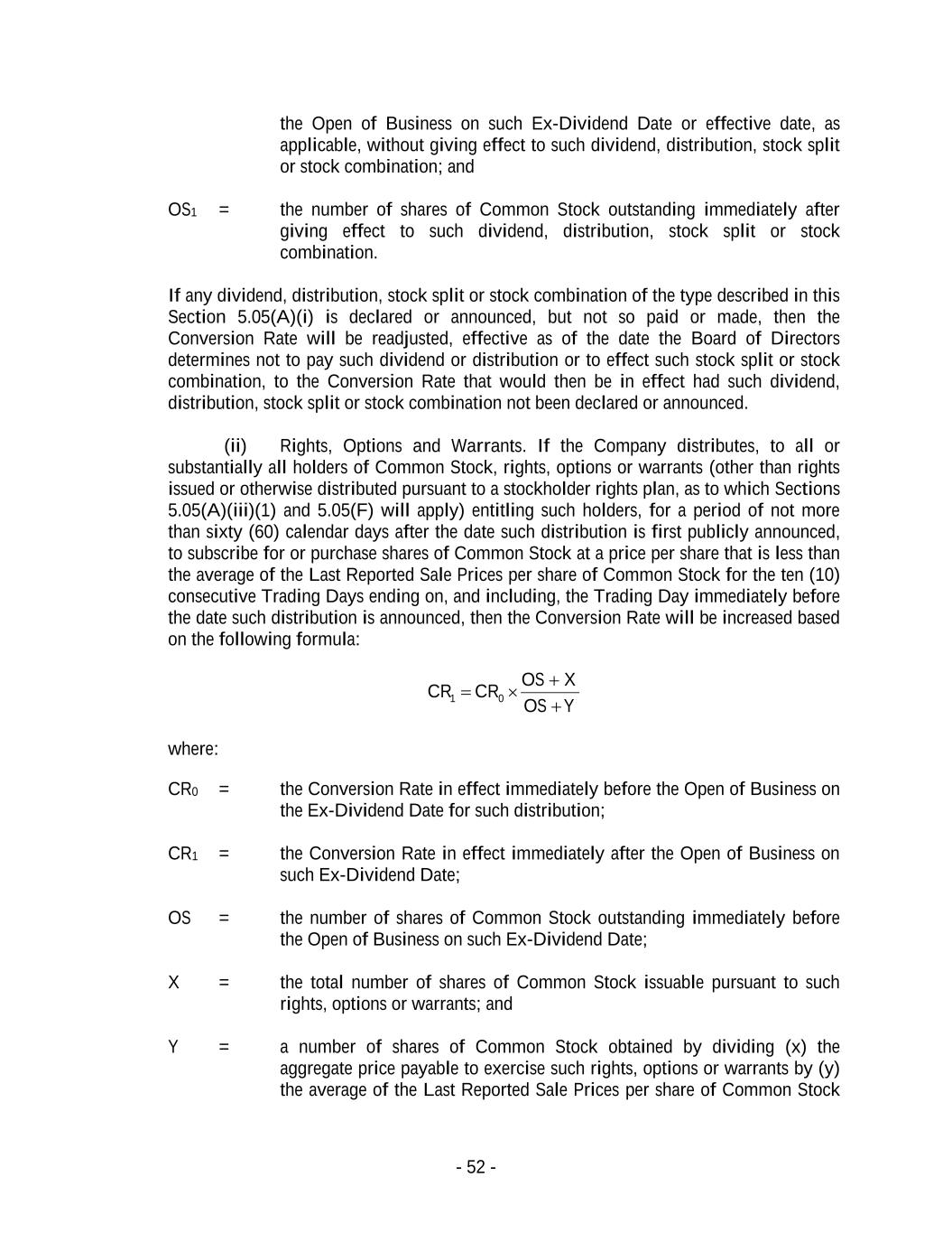 - 52 - the Open of Business on such Ex-Dividend Date or effective date, as applicable, without giving effect to such dividend, distribution, stock split or stock combination; and OS1 = the number of shares of Common Stock outstanding immediately after giving effect to such dividend, distribution, stock split or stock combination. If any dividend, distribution, stock split or stock combination of the type described in this Section 5.05(A)(i) is declared or announced, but not so paid or made, then the Conversion Rate will be readjusted, effective as of the date the Board of Directors determines not to pay such dividend or distribution or to effect such stock split or stock combination, to the Conversion Rate that would then be in effect had such dividend, distribution, stock split or stock combination not been declared or announced. (ii) Rights, Options and Warrants. If the Company distributes, to all or substantially all holders of Common Stock, rights, options or warrants (other than rights issued or otherwise distributed pursuant to a stockholder rights plan, as to which Sections 5.05(A)(iii)(1) and 5.05(F) will apply) entitling such holders, for a period of not more than sixty (60) calendar days after the date such distribution is first publicly announced, to subscribe for or purchase shares of Common Stock at a price per share that is less than the average of the Last Reported Sale Prices per share of Common Stock for the ten (10) consecutive Trading Days ending on, and including, the Trading Day immediately before the date such distribution is announced, then the Conversion Rate will be increased based on the following formula: YOS XOS CRCR + + = 01 where: CR0 = the Conversion Rate in effect immediately before the Open of Business on the Ex-Dividend Date for such distribution; CR1 = the Conversion Rate in effect immediately after the Open of Business on such Ex-Dividend Date; OS = the number of shares of Common Stock outstanding immediately before the Open of Business on such Ex-Dividend Date; X = the total number of shares of Common Stock issuable pursuant to such rights, options or warrants; and Y = a number of shares of Common Stock obtained by dividing (x) the aggregate price payable to exercise such rights, options or warrants by (y) the average of the Last Reported Sale Prices per share of Common Stock