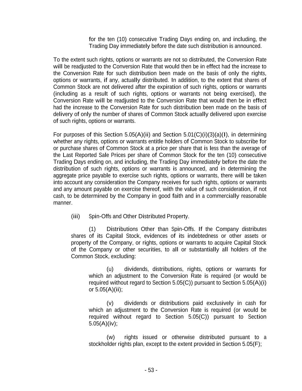- 53 - for the ten (10) consecutive Trading Days ending on, and including, the Trading Day immediately before the date such distribution is announced. To the extent such rights, options or warrants are not so distributed, the Conversion Rate will be readjusted to the Conversion Rate that would then be in effect had the increase to the Conversion Rate for such distribution been made on the basis of only the rights, options or warrants, if any, actually distributed. In addition, to the extent that shares of Common Stock are not delivered after the expiration of such rights, options or warrants (including as a result of such rights, options or warrants not being exercised), the Conversion Rate will be readjusted to the Conversion Rate that would then be in effect had the increase to the Conversion Rate for such distribution been made on the basis of delivery of only the number of shares of Common Stock actually delivered upon exercise of such rights, options or warrants. For purposes of this Section 5.05(A)(ii) and Section 5.01(C)(i)(3)(a)(I), in determining whether any rights, options or warrants entitle holders of Common Stock to subscribe for or purchase shares of Common Stock at a price per share that is less than the average of the Last Reported Sale Prices per share of Common Stock for the ten (10) consecutive Trading Days ending on, and including, the Trading Day immediately before the date the distribution of such rights, options or warrants is announced, and in determining the aggregate price payable to exercise such rights, options or warrants, there will be taken into account any consideration the Company receives for such rights, options or warrants and any amount payable on exercise thereof, with the value of such consideration, if not cash, to be determined by the Company in good faith and in a commercially reasonable manner. (iii) Spin-Offs and Other Distributed Property. (1) Distributions Other than Spin-Offs. If the Company distributes shares of its Capital Stock, evidences of its indebtedness or other assets or property of the Company, or rights, options or warrants to acquire Capital Stock of the Company or other securities, to all or substantially all holders of the Common Stock, excluding: (u) dividends, distributions, rights, options or warrants for which an adjustment to the Conversion Rate is required (or would be required without regard to Section 5.05(C)) pursuant to Section 5.05(A)(i) or 5.05(A)(ii); (v) dividends or distributions paid exclusively in cash for which an adjustment to the Conversion Rate is required (or would be required without regard to Section 5.05(C)) pursuant to Section 5.05(A)(iv); (w) rights issued or otherwise distributed pursuant to a stockholder rights plan, except to the extent provided in Section 5.05(F);