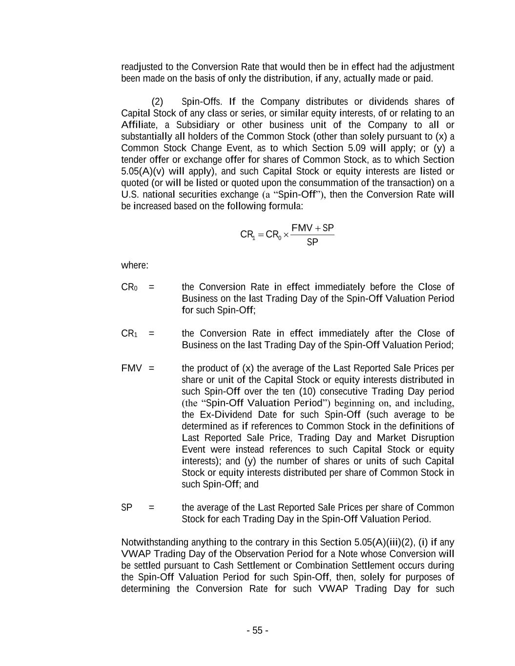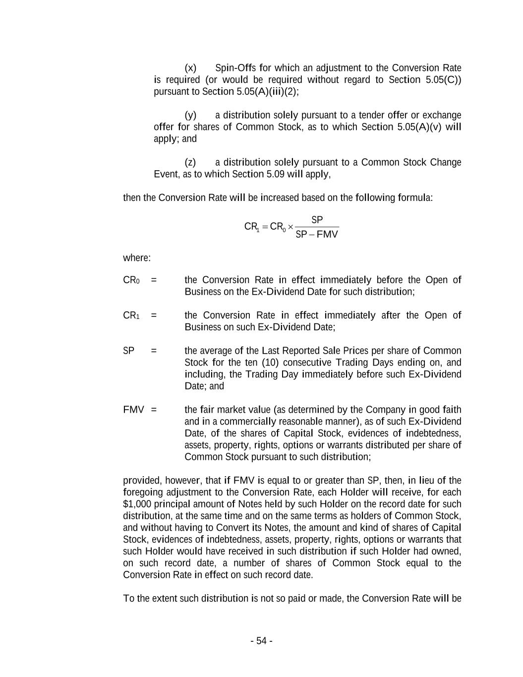 - 54 - (x) Spin-Offs for which an adjustment to the Conversion Rate is required (or would be required without regard to Section 5.05(C)) pursuant to Section 5.05(A)(iii)(2); (y) a distribution solely pursuant to a tender offer or exchange offer for shares of Common Stock, as to which Section 5.05(A)(v) will apply; and (z) a distribution solely pursuant to a Common Stock Change Event, as to which Section 5.09 will apply, then the Conversion Rate will be increased based on the following formula: FMVSP SP CRCR − = 01 where: CR0 = the Conversion Rate in effect immediately before the Open of Business on the Ex-Dividend Date for such distribution; CR1 = the Conversion Rate in effect immediately after the Open of Business on such Ex-Dividend Date; SP = the average of the Last Reported Sale Prices per share of Common Stock for the ten (10) consecutive Trading Days ending on, and including, the Trading Day immediately before such Ex-Dividend Date; and FMV = the fair market value (as determined by the Company in good faith and in a commercially reasonable manner), as of such Ex-Dividend Date, of the shares of Capital Stock, evidences of indebtedness, assets, property, rights, options or warrants distributed per share of Common Stock pursuant to such distribution; provided, however, that if FMV is equal to or greater than SP, then, in lieu of the foregoing adjustment to the Conversion Rate, each Holder will receive, for each $1,000 principal amount of Notes held by such Holder on the record date for such distribution, at the same time and on the same terms as holders of Common Stock, and without having to Convert its Notes, the amount and kind of shares of Capital Stock, evidences of indebtedness, assets, property, rights, options or warrants that such Holder would have received in such distribution if such Holder had owned, on such record date, a number of shares of Common Stock equal to the Conversion Rate in effect on such record date. To the extent such distribution is not so paid or made, the Conversion Rate will be