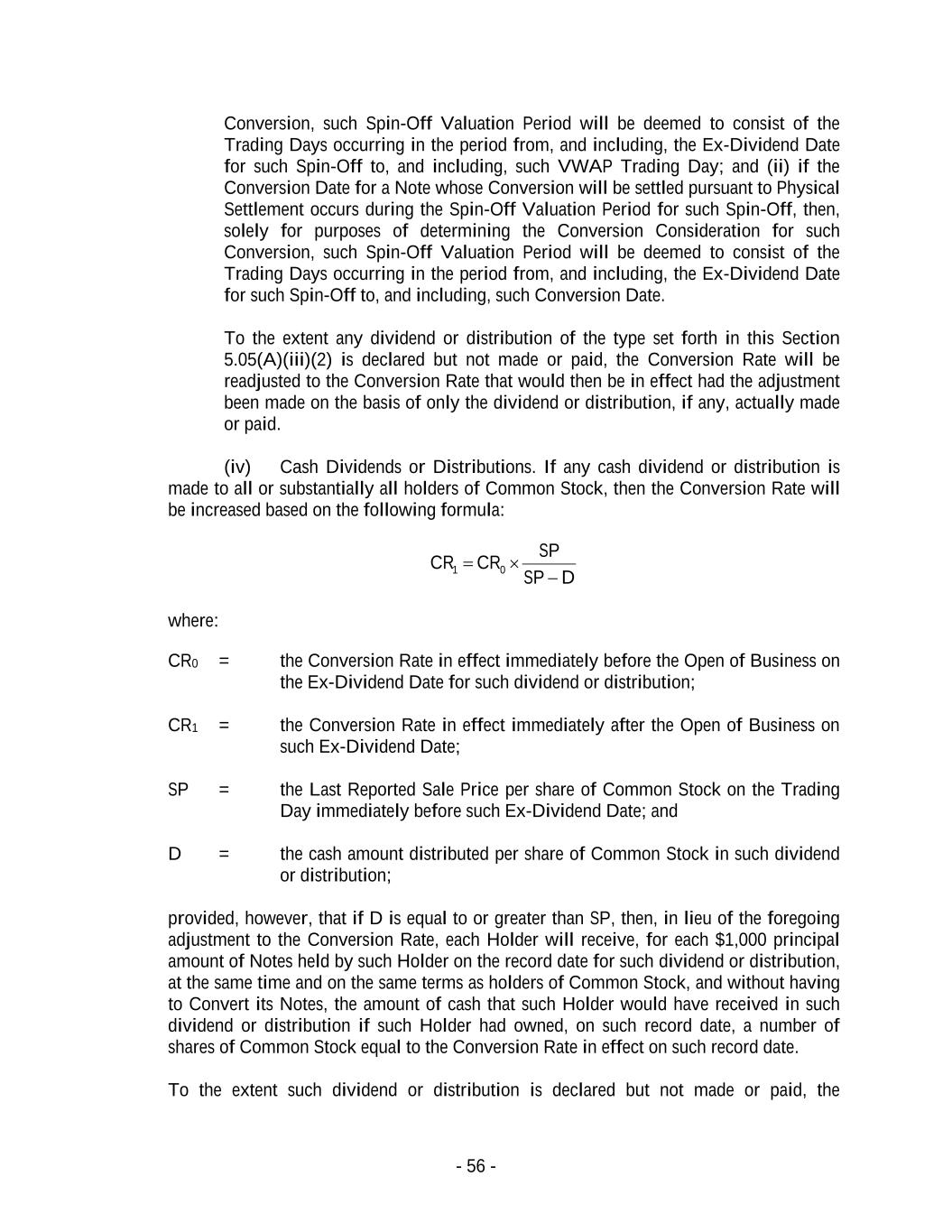 - 56 - Conversion, such Spin-Off Valuation Period will be deemed to consist of the Trading Days occurring in the period from, and including, the Ex-Dividend Date for such Spin-Off to, and including, such VWAP Trading Day; and (ii) if the Conversion Date for a Note whose Conversion will be settled pursuant to Physical Settlement occurs during the Spin-Off Valuation Period for such Spin-Off, then, solely for purposes of determining the Conversion Consideration for such Conversion, such Spin-Off Valuation Period will be deemed to consist of the Trading Days occurring in the period from, and including, the Ex-Dividend Date for such Spin-Off to, and including, such Conversion Date. To the extent any dividend or distribution of the type set forth in this Section 5.05(A)(iii)(2) is declared but not made or paid, the Conversion Rate will be readjusted to the Conversion Rate that would then be in effect had the adjustment been made on the basis of only the dividend or distribution, if any, actually made or paid. (iv) Cash Dividends or Distributions. If any cash dividend or distribution is made to all or substantially all holders of Common Stock, then the Conversion Rate will be increased based on the following formula: DSP SP CRCR − = 01 where: CR0 = the Conversion Rate in effect immediately before the Open of Business on the Ex-Dividend Date for such dividend or distribution; CR1 = the Conversion Rate in effect immediately after the Open of Business on such Ex-Dividend Date; SP = the Last Reported Sale Price per share of Common Stock on the Trading Day immediately before such Ex-Dividend Date; and D = the cash amount distributed per share of Common Stock in such dividend or distribution; provided, however, that if D is equal to or greater than SP, then, in lieu of the foregoing adjustment to the Conversion Rate, each Holder will receive, for each $1,000 principal amount of Notes held by such Holder on the record date for such dividend or distribution, at the same time and on the same terms as holders of Common Stock, and without having to Convert its Notes, the amount of cash that such Holder would have received in such dividend or distribution if such Holder had owned, on such record date, a number of shares of Common Stock equal to the Conversion Rate in effect on such record date. To the extent such dividend or distribution is declared but not made or paid, the