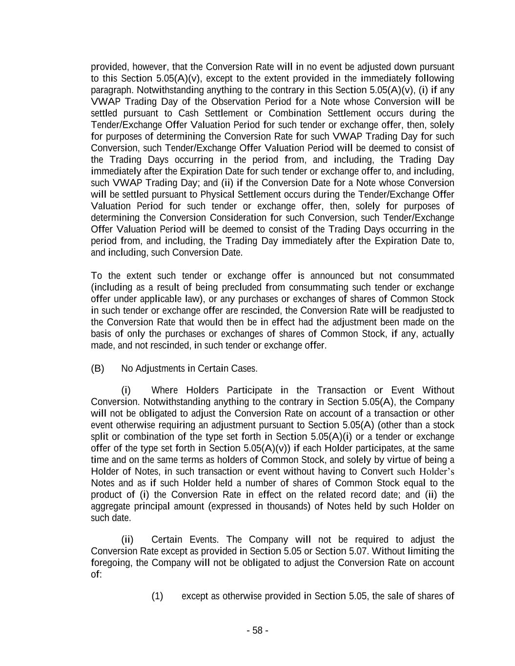 - 58 - provided, however, that the Conversion Rate will in no event be adjusted down pursuant to this Section 5.05(A)(v), except to the extent provided in the immediately following paragraph. Notwithstanding anything to the contrary in this Section 5.05(A)(v), (i) if any VWAP Trading Day of the Observation Period for a Note whose Conversion will be settled pursuant to Cash Settlement or Combination Settlement occurs during the Tender/Exchange Offer Valuation Period for such tender or exchange offer, then, solely for purposes of determining the Conversion Rate for such VWAP Trading Day for such Conversion, such Tender/Exchange Offer Valuation Period will be deemed to consist of the Trading Days occurring in the period from, and including, the Trading Day immediately after the Expiration Date for such tender or exchange offer to, and including, such VWAP Trading Day; and (ii) if the Conversion Date for a Note whose Conversion will be settled pursuant to Physical Settlement occurs during the Tender/Exchange Offer Valuation Period for such tender or exchange offer, then, solely for purposes of determining the Conversion Consideration for such Conversion, such Tender/Exchange Offer Valuation Period will be deemed to consist of the Trading Days occurring in the period from, and including, the Trading Day immediately after the Expiration Date to, and including, such Conversion Date. To the extent such tender or exchange offer is announced but not consummated (including as a result of being precluded from consummating such tender or exchange offer under applicable law), or any purchases or exchanges of shares of Common Stock in such tender or exchange offer are rescinded, the Conversion Rate will be readjusted to the Conversion Rate that would then be in effect had the adjustment been made on the basis of only the purchases or exchanges of shares of Common Stock, if any, actually made, and not rescinded, in such tender or exchange offer. (B) No Adjustments in Certain Cases. (i) Where Holders Participate in the Transaction or Event Without Conversion. Notwithstanding anything to the contrary in Section 5.05(A), the Company will not be obligated to adjust the Conversion Rate on account of a transaction or other event otherwise requiring an adjustment pursuant to Section 5.05(A) (other than a stock split or combination of the type set forth in Section 5.05(A)(i) or a tender or exchange offer of the type set forth in Section 5.05(A)(v)) if each Holder participates, at the same time and on the same terms as holders of Common Stock, and solely by virtue of being a Holder of Notes, in such transaction or event without having to Convert such Holder’s Notes and as if such Holder held a number of shares of Common Stock equal to the product of (i) the Conversion Rate in effect on the related record date; and (ii) the aggregate principal amount (expressed in thousands) of Notes held by such Holder on such date. (ii) Certain Events. The Company will not be required to adjust the Conversion Rate except as provided in Section 5.05 or Section 5.07. Without limiting the foregoing, the Company will not be obligated to adjust the Conversion Rate on account of: (1) except as otherwise provided in Section 5.05, the sale of shares of