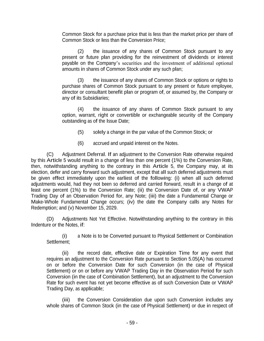 - 59 - Common Stock for a purchase price that is less than the market price per share of Common Stock or less than the Conversion Price; (2) the issuance of any shares of Common Stock pursuant to any present or future plan providing for the reinvestment of dividends or interest payable on the Company’s securities and the investment of additional optional amounts in shares of Common Stock under any such plan; (3) the issuance of any shares of Common Stock or options or rights to purchase shares of Common Stock pursuant to any present or future employee, director or consultant benefit plan or program of, or assumed by, the Company or any of its Subsidiaries; (4) the issuance of any shares of Common Stock pursuant to any option, warrant, right or convertible or exchangeable security of the Company outstanding as of the Issue Date; (5) solely a change in the par value of the Common Stock; or (6) accrued and unpaid interest on the Notes. (C) Adjustment Deferral. If an adjustment to the Conversion Rate otherwise required by this Article 5 would result in a change of less than one percent (1%) to the Conversion Rate, then, notwithstanding anything to the contrary in this Article 5, the Company may, at its election, defer and carry forward such adjustment, except that all such deferred adjustments must be given effect immediately upon the earliest of the following: (i) when all such deferred adjustments would, had they not been so deferred and carried forward, result in a change of at least one percent (1%) to the Conversion Rate; (ii) the Conversion Date of, or any VWAP Trading Day of an Observation Period for, any Note; (iii) the date a Fundamental Change or Make-Whole Fundamental Change occurs; (iv) the date the Company calls any Notes for Redemption; and (v) November 15, 2029. (D) Adjustments Not Yet Effective. Notwithstanding anything to the contrary in this Indenture or the Notes, if: (i) a Note is to be Converted pursuant to Physical Settlement or Combination Settlement; (ii) the record date, effective date or Expiration Time for any event that requires an adjustment to the Conversion Rate pursuant to Section 5.05(A) has occurred on or before the Conversion Date for such Conversion (in the case of Physical Settlement) or on or before any VWAP Trading Day in the Observation Period for such Conversion (in the case of Combination Settlement), but an adjustment to the Conversion Rate for such event has not yet become effective as of such Conversion Date or VWAP Trading Day, as applicable; (iii) the Conversion Consideration due upon such Conversion includes any whole shares of Common Stock (in the case of Physical Settlement) or due in respect of