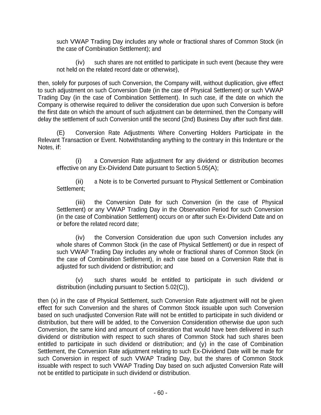 - 60 - such VWAP Trading Day includes any whole or fractional shares of Common Stock (in the case of Combination Settlement); and (iv) such shares are not entitled to participate in such event (because they were not held on the related record date or otherwise), then, solely for purposes of such Conversion, the Company will, without duplication, give effect to such adjustment on such Conversion Date (in the case of Physical Settlement) or such VWAP Trading Day (in the case of Combination Settlement). In such case, if the date on which the Company is otherwise required to deliver the consideration due upon such Conversion is before the first date on which the amount of such adjustment can be determined, then the Company will delay the settlement of such Conversion until the second (2nd) Business Day after such first date. (E) Conversion Rate Adjustments Where Converting Holders Participate in the Relevant Transaction or Event. Notwithstanding anything to the contrary in this Indenture or the Notes, if: (i) a Conversion Rate adjustment for any dividend or distribution becomes effective on any Ex-Dividend Date pursuant to Section 5.05(A); (ii) a Note is to be Converted pursuant to Physical Settlement or Combination Settlement; (iii) the Conversion Date for such Conversion (in the case of Physical Settlement) or any VWAP Trading Day in the Observation Period for such Conversion (in the case of Combination Settlement) occurs on or after such Ex-Dividend Date and on or before the related record date; (iv) the Conversion Consideration due upon such Conversion includes any whole shares of Common Stock (in the case of Physical Settlement) or due in respect of such VWAP Trading Day includes any whole or fractional shares of Common Stock (in the case of Combination Settlement), in each case based on a Conversion Rate that is adjusted for such dividend or distribution; and (v) such shares would be entitled to participate in such dividend or distribution (including pursuant to Section 5.02(C)), then (x) in the case of Physical Settlement, such Conversion Rate adjustment will not be given effect for such Conversion and the shares of Common Stock issuable upon such Conversion based on such unadjusted Conversion Rate will not be entitled to participate in such dividend or distribution, but there will be added, to the Conversion Consideration otherwise due upon such Conversion, the same kind and amount of consideration that would have been delivered in such dividend or distribution with respect to such shares of Common Stock had such shares been entitled to participate in such dividend or distribution; and (y) in the case of Combination Settlement, the Conversion Rate adjustment relating to such Ex-Dividend Date will be made for such Conversion in respect of such VWAP Trading Day, but the shares of Common Stock issuable with respect to such VWAP Trading Day based on such adjusted Conversion Rate will not be entitled to participate in such dividend or distribution.