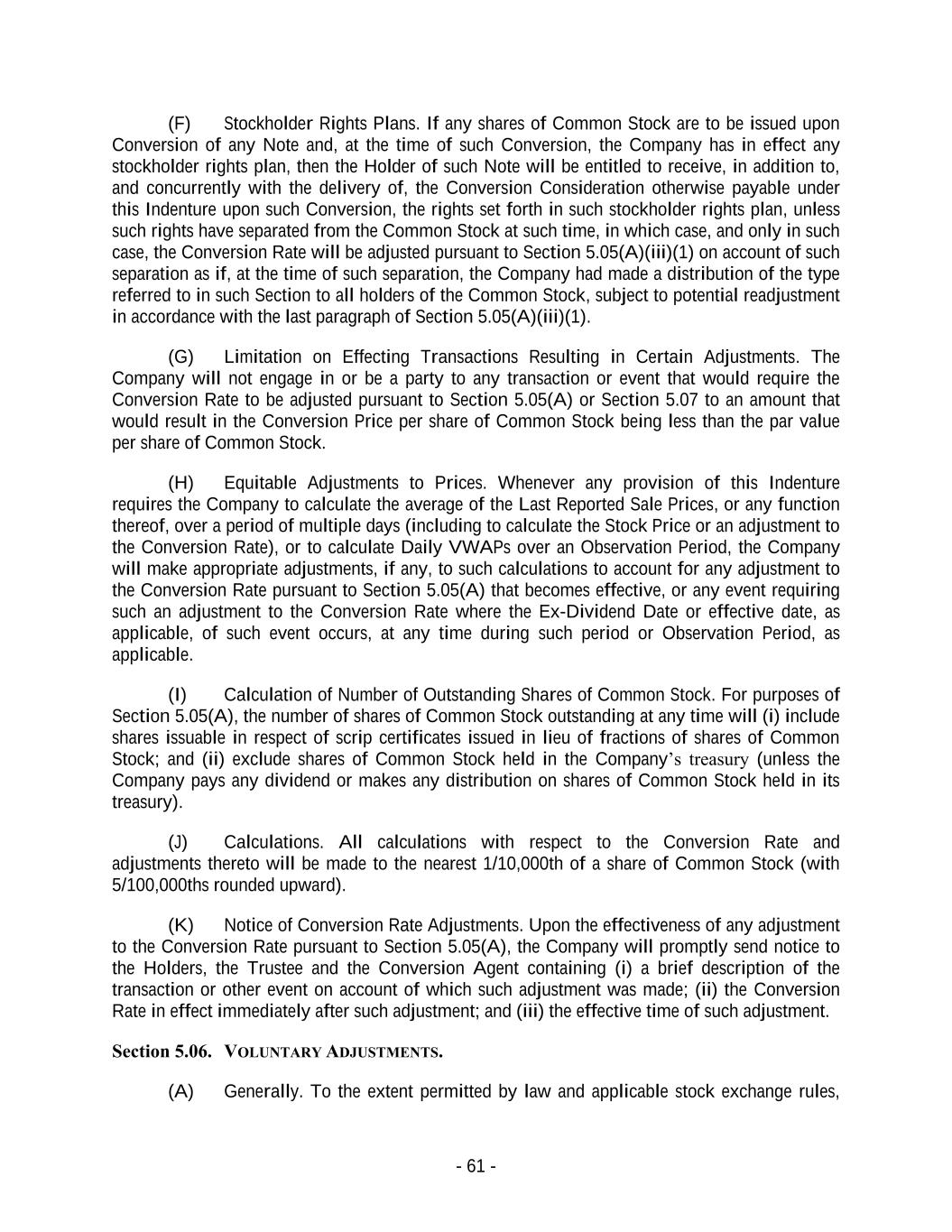 - 61 - (F) Stockholder Rights Plans. If any shares of Common Stock are to be issued upon Conversion of any Note and, at the time of such Conversion, the Company has in effect any stockholder rights plan, then the Holder of such Note will be entitled to receive, in addition to, and concurrently with the delivery of, the Conversion Consideration otherwise payable under this Indenture upon such Conversion, the rights set forth in such stockholder rights plan, unless such rights have separated from the Common Stock at such time, in which case, and only in such case, the Conversion Rate will be adjusted pursuant to Section 5.05(A)(iii)(1) on account of such separation as if, at the time of such separation, the Company had made a distribution of the type referred to in such Section to all holders of the Common Stock, subject to potential readjustment in accordance with the last paragraph of Section 5.05(A)(iii)(1). (G) Limitation on Effecting Transactions Resulting in Certain Adjustments. The Company will not engage in or be a party to any transaction or event that would require the Conversion Rate to be adjusted pursuant to Section 5.05(A) or Section 5.07 to an amount that would result in the Conversion Price per share of Common Stock being less than the par value per share of Common Stock. (H) Equitable Adjustments to Prices. Whenever any provision of this Indenture requires the Company to calculate the average of the Last Reported Sale Prices, or any function thereof, over a period of multiple days (including to calculate the Stock Price or an adjustment to the Conversion Rate), or to calculate Daily VWAPs over an Observation Period, the Company will make appropriate adjustments, if any, to such calculations to account for any adjustment to the Conversion Rate pursuant to Section 5.05(A) that becomes effective, or any event requiring such an adjustment to the Conversion Rate where the Ex-Dividend Date or effective date, as applicable, of such event occurs, at any time during such period or Observation Period, as applicable. (I) Calculation of Number of Outstanding Shares of Common Stock. For purposes of Section 5.05(A), the number of shares of Common Stock outstanding at any time will (i) include shares issuable in respect of scrip certificates issued in lieu of fractions of shares of Common Stock; and (ii) exclude shares of Common Stock held in the Company’s treasury (unless the Company pays any dividend or makes any distribution on shares of Common Stock held in its treasury). (J) Calculations. All calculations with respect to the Conversion Rate and adjustments thereto will be made to the nearest 1/10,000th of a share of Common Stock (with 5/100,000ths rounded upward). (K) Notice of Conversion Rate Adjustments. Upon the effectiveness of any adjustment to the Conversion Rate pursuant to Section 5.05(A), the Company will promptly send notice to the Holders, the Trustee and the Conversion Agent containing (i) a brief description of the transaction or other event on account of which such adjustment was made; (ii) the Conversion Rate in effect immediately after such adjustment; and (iii) the effective time of such adjustment. Section 5.06. VOLUNTARY ADJUSTMENTS. (A) Generally. To the extent permitted by law and applicable stock exchange rules,