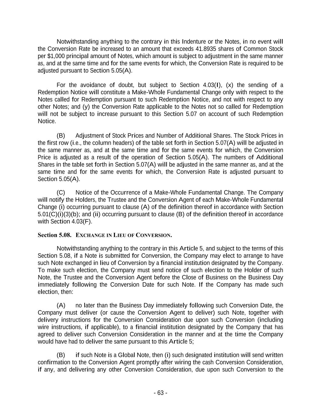 - 63 - Notwithstanding anything to the contrary in this Indenture or the Notes, in no event will the Conversion Rate be increased to an amount that exceeds 41.8935 shares of Common Stock per $1,000 principal amount of Notes, which amount is subject to adjustment in the same manner as, and at the same time and for the same events for which, the Conversion Rate is required to be adjusted pursuant to Section 5.05(A). For the avoidance of doubt, but subject to Section 4.03(I), (x) the sending of a Redemption Notice will constitute a Make-Whole Fundamental Change only with respect to the Notes called for Redemption pursuant to such Redemption Notice, and not with respect to any other Notes; and (y) the Conversion Rate applicable to the Notes not so called for Redemption will not be subject to increase pursuant to this Section 5.07 on account of such Redemption Notice. (B) Adjustment of Stock Prices and Number of Additional Shares. The Stock Prices in the first row (i.e., the column headers) of the table set forth in Section 5.07(A) will be adjusted in the same manner as, and at the same time and for the same events for which, the Conversion Price is adjusted as a result of the operation of Section 5.05(A). The numbers of Additional Shares in the table set forth in Section 5.07(A) will be adjusted in the same manner as, and at the same time and for the same events for which, the Conversion Rate is adjusted pursuant to Section 5.05(A). (C) Notice of the Occurrence of a Make-Whole Fundamental Change. The Company will notify the Holders, the Trustee and the Conversion Agent of each Make-Whole Fundamental Change (i) occurring pursuant to clause (A) of the definition thereof in accordance with Section 5.01(C)(i)(3)(b); and (ii) occurring pursuant to clause (B) of the definition thereof in accordance with Section 4.03(F). Section 5.08. EXCHANGE IN LIEU OF CONVERSION. Notwithstanding anything to the contrary in this Article 5, and subject to the terms of this Section 5.08, if a Note is submitted for Conversion, the Company may elect to arrange to have such Note exchanged in lieu of Conversion by a financial institution designated by the Company. To make such election, the Company must send notice of such election to the Holder of such Note, the Trustee and the Conversion Agent before the Close of Business on the Business Day immediately following the Conversion Date for such Note. If the Company has made such election, then: (A) no later than the Business Day immediately following such Conversion Date, the Company must deliver (or cause the Conversion Agent to deliver) such Note, together with delivery instructions for the Conversion Consideration due upon such Conversion (including wire instructions, if applicable), to a financial institution designated by the Company that has agreed to deliver such Conversion Consideration in the manner and at the time the Company would have had to deliver the same pursuant to this Article 5; (B) if such Note is a Global Note, then (i) such designated institution will send written confirmation to the Conversion Agent promptly after wiring the cash Conversion Consideration, if any, and delivering any other Conversion Consideration, due upon such Conversion to the