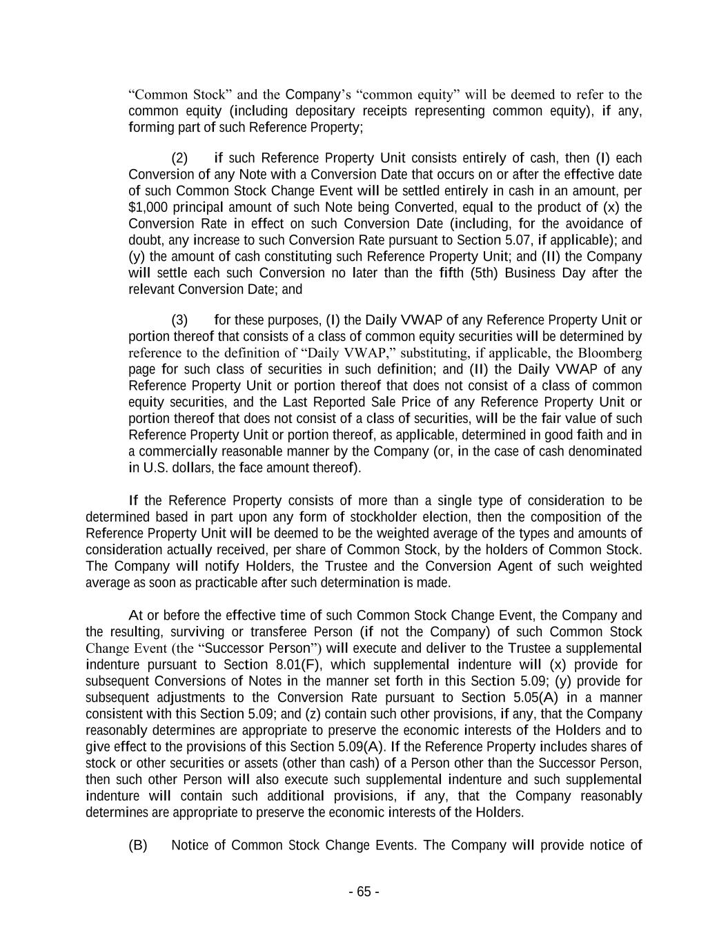 - 65 - “Common Stock” and the Company’s “common equity” will be deemed to refer to the common equity (including depositary receipts representing common equity), if any, forming part of such Reference Property; (2) if such Reference Property Unit consists entirely of cash, then (I) each Conversion of any Note with a Conversion Date that occurs on or after the effective date of such Common Stock Change Event will be settled entirely in cash in an amount, per $1,000 principal amount of such Note being Converted, equal to the product of (x) the Conversion Rate in effect on such Conversion Date (including, for the avoidance of doubt, any increase to such Conversion Rate pursuant to Section 5.07, if applicable); and (y) the amount of cash constituting such Reference Property Unit; and (II) the Company will settle each such Conversion no later than the fifth (5th) Business Day after the relevant Conversion Date; and (3) for these purposes, (I) the Daily VWAP of any Reference Property Unit or portion thereof that consists of a class of common equity securities will be determined by reference to the definition of “Daily VWAP,” substituting, if applicable, the Bloomberg page for such class of securities in such definition; and (II) the Daily VWAP of any Reference Property Unit or portion thereof that does not consist of a class of common equity securities, and the Last Reported Sale Price of any Reference Property Unit or portion thereof that does not consist of a class of securities, will be the fair value of such Reference Property Unit or portion thereof, as applicable, determined in good faith and in a commercially reasonable manner by the Company (or, in the case of cash denominated in U.S. dollars, the face amount thereof). If the Reference Property consists of more than a single type of consideration to be determined based in part upon any form of stockholder election, then the composition of the Reference Property Unit will be deemed to be the weighted average of the types and amounts of consideration actually received, per share of Common Stock, by the holders of Common Stock. The Company will notify Holders, the Trustee and the Conversion Agent of such weighted average as soon as practicable after such determination is made. At or before the effective time of such Common Stock Change Event, the Company and the resulting, surviving or transferee Person (if not the Company) of such Common Stock Change Event (the “Successor Person”) will execute and deliver to the Trustee a supplemental indenture pursuant to Section 8.01(F), which supplemental indenture will (x) provide for subsequent Conversions of Notes in the manner set forth in this Section 5.09; (y) provide for subsequent adjustments to the Conversion Rate pursuant to Section 5.05(A) in a manner consistent with this Section 5.09; and (z) contain such other provisions, if any, that the Company reasonably determines are appropriate to preserve the economic interests of the Holders and to give effect to the provisions of this Section 5.09(A). If the Reference Property includes shares of stock or other securities or assets (other than cash) of a Person other than the Successor Person, then such other Person will also execute such supplemental indenture and such supplemental indenture will contain such additional provisions, if any, that the Company reasonably determines are appropriate to preserve the economic interests of the Holders. (B) Notice of Common Stock Change Events. The Company will provide notice of