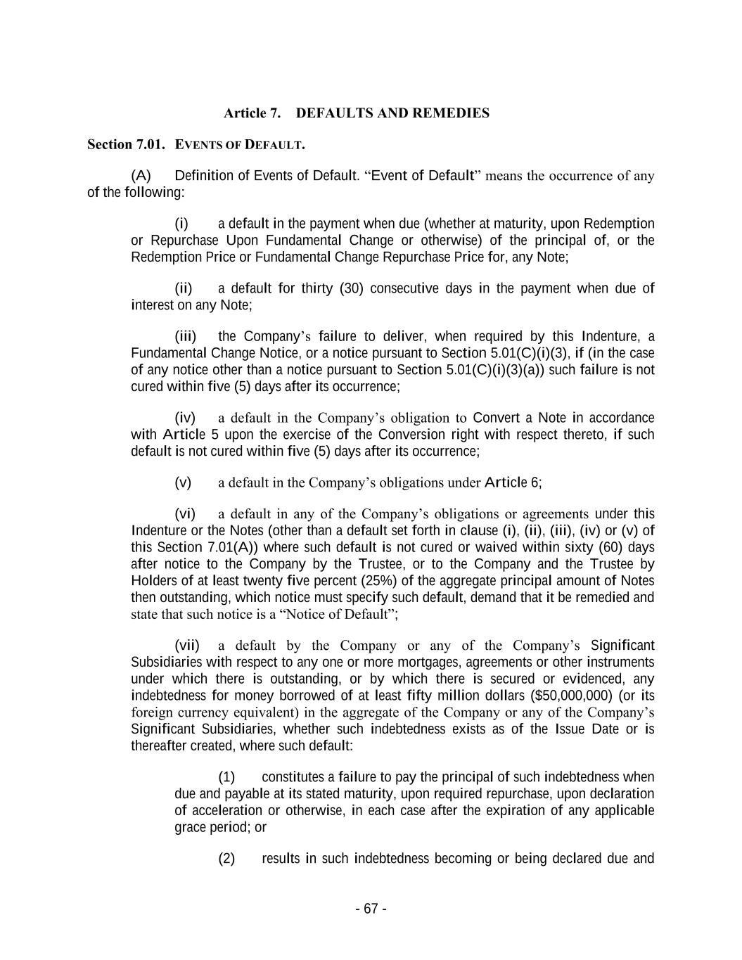 - 67 - Article 7. DEFAULTS AND REMEDIES Section 7.01. EVENTS OF DEFAULT. (A) Definition of Events of Default. “Event of Default” means the occurrence of any of the following: (i) a default in the payment when due (whether at maturity, upon Redemption or Repurchase Upon Fundamental Change or otherwise) of the principal of, or the Redemption Price or Fundamental Change Repurchase Price for, any Note; (ii) a default for thirty (30) consecutive days in the payment when due of interest on any Note; (iii) the Company’s failure to deliver, when required by this Indenture, a Fundamental Change Notice, or a notice pursuant to Section 5.01(C)(i)(3), if (in the case of any notice other than a notice pursuant to Section 5.01(C)(i)(3)(a)) such failure is not cured within five (5) days after its occurrence; (iv) a default in the Company’s obligation to Convert a Note in accordance with Article 5 upon the exercise of the Conversion right with respect thereto, if such default is not cured within five (5) days after its occurrence; (v) a default in the Company’s obligations under Article 6; (vi) a default in any of the Company’s obligations or agreements under this Indenture or the Notes (other than a default set forth in clause (i), (ii), (iii), (iv) or (v) of this Section 7.01(A)) where such default is not cured or waived within sixty (60) days after notice to the Company by the Trustee, or to the Company and the Trustee by Holders of at least twenty five percent (25%) of the aggregate principal amount of Notes then outstanding, which notice must specify such default, demand that it be remedied and state that such notice is a “Notice of Default”; (vii) a default by the Company or any of the Company’s Significant Subsidiaries with respect to any one or more mortgages, agreements or other instruments under which there is outstanding, or by which there is secured or evidenced, any indebtedness for money borrowed of at least fifty million dollars ($50,000,000) (or its foreign currency equivalent) in the aggregate of the Company or any of the Company’s Significant Subsidiaries, whether such indebtedness exists as of the Issue Date or is thereafter created, where such default: (1) constitutes a failure to pay the principal of such indebtedness when due and payable at its stated maturity, upon required repurchase, upon declaration of acceleration or otherwise, in each case after the expiration of any applicable grace period; or (2) results in such indebtedness becoming or being declared due and