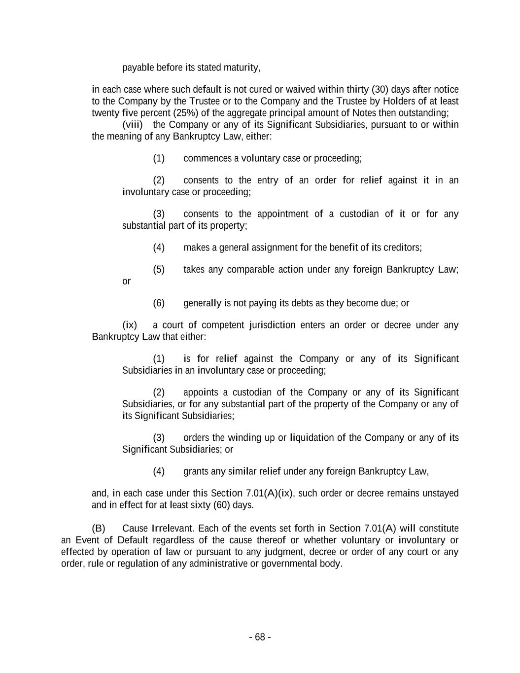 - 68 - payable before its stated maturity, in each case where such default is not cured or waived within thirty (30) days after notice to the Company by the Trustee or to the Company and the Trustee by Holders of at least twenty five percent (25%) of the aggregate principal amount of Notes then outstanding; (viii) the Company or any of its Significant Subsidiaries, pursuant to or within the meaning of any Bankruptcy Law, either: (1) commences a voluntary case or proceeding; (2) consents to the entry of an order for relief against it in an involuntary case or proceeding; (3) consents to the appointment of a custodian of it or for any substantial part of its property; (4) makes a general assignment for the benefit of its creditors; (5) takes any comparable action under any foreign Bankruptcy Law; or (6) generally is not paying its debts as they become due; or (ix) a court of competent jurisdiction enters an order or decree under any Bankruptcy Law that either: (1) is for relief against the Company or any of its Significant Subsidiaries in an involuntary case or proceeding; (2) appoints a custodian of the Company or any of its Significant Subsidiaries, or for any substantial part of the property of the Company or any of its Significant Subsidiaries; (3) orders the winding up or liquidation of the Company or any of its Significant Subsidiaries; or (4) grants any similar relief under any foreign Bankruptcy Law, and, in each case under this Section 7.01(A)(ix), such order or decree remains unstayed and in effect for at least sixty (60) days. (B) Cause Irrelevant. Each of the events set forth in Section 7.01(A) will constitute an Event of Default regardless of the cause thereof or whether voluntary or involuntary or effected by operation of law or pursuant to any judgment, decree or order of any court or any order, rule or regulation of any administrative or governmental body.