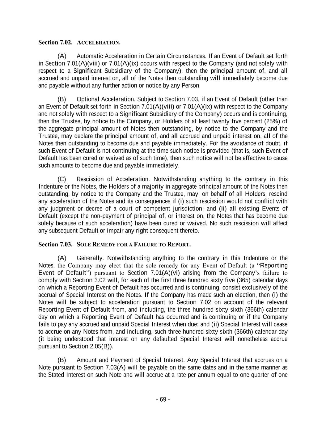 - 69 - Section 7.02. ACCELERATION. (A) Automatic Acceleration in Certain Circumstances. If an Event of Default set forth in Section 7.01(A)(viii) or 7.01(A)(ix) occurs with respect to the Company (and not solely with respect to a Significant Subsidiary of the Company), then the principal amount of, and all accrued and unpaid interest on, all of the Notes then outstanding will immediately become due and payable without any further action or notice by any Person. (B) Optional Acceleration. Subject to Section 7.03, if an Event of Default (other than an Event of Default set forth in Section 7.01(A)(viii) or 7.01(A)(ix) with respect to the Company and not solely with respect to a Significant Subsidiary of the Company) occurs and is continuing, then the Trustee, by notice to the Company, or Holders of at least twenty five percent (25%) of the aggregate principal amount of Notes then outstanding, by notice to the Company and the Trustee, may declare the principal amount of, and all accrued and unpaid interest on, all of the Notes then outstanding to become due and payable immediately. For the avoidance of doubt, if such Event of Default is not continuing at the time such notice is provided (that is, such Event of Default has been cured or waived as of such time), then such notice will not be effective to cause such amounts to become due and payable immediately. (C) Rescission of Acceleration. Notwithstanding anything to the contrary in this Indenture or the Notes, the Holders of a majority in aggregate principal amount of the Notes then outstanding, by notice to the Company and the Trustee, may, on behalf of all Holders, rescind any acceleration of the Notes and its consequences if (i) such rescission would not conflict with any judgment or decree of a court of competent jurisdiction; and (ii) all existing Events of Default (except the non-payment of principal of, or interest on, the Notes that has become due solely because of such acceleration) have been cured or waived. No such rescission will affect any subsequent Default or impair any right consequent thereto. Section 7.03. SOLE REMEDY FOR A FAILURE TO REPORT. (A) Generally. Notwithstanding anything to the contrary in this Indenture or the Notes, the Company may elect that the sole remedy for any Event of Default (a “Reporting Event of Default”) pursuant to Section 7.01(A)(vi) arising from the Company’s failure to comply with Section 3.02 will, for each of the first three hundred sixty five (365) calendar days on which a Reporting Event of Default has occurred and is continuing, consist exclusively of the accrual of Special Interest on the Notes. If the Company has made such an election, then (i) the Notes will be subject to acceleration pursuant to Section 7.02 on account of the relevant Reporting Event of Default from, and including, the three hundred sixty sixth (366th) calendar day on which a Reporting Event of Default has occurred and is continuing or if the Company fails to pay any accrued and unpaid Special Interest when due; and (ii) Special Interest will cease to accrue on any Notes from, and including, such three hundred sixty sixth (366th) calendar day (it being understood that interest on any defaulted Special Interest will nonetheless accrue pursuant to Section 2.05(B)). (B) Amount and Payment of Special Interest. Any Special Interest that accrues on a Note pursuant to Section 7.03(A) will be payable on the same dates and in the same manner as the Stated Interest on such Note and will accrue at a rate per annum equal to one quarter of one