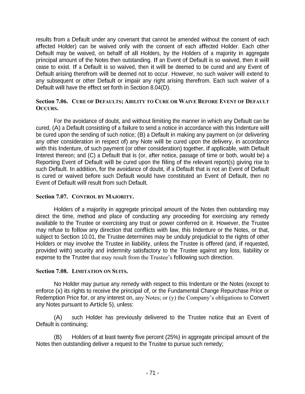 - 71 - results from a Default under any covenant that cannot be amended without the consent of each affected Holder) can be waived only with the consent of each affected Holder. Each other Default may be waived, on behalf of all Holders, by the Holders of a majority in aggregate principal amount of the Notes then outstanding. If an Event of Default is so waived, then it will cease to exist. If a Default is so waived, then it will be deemed to be cured and any Event of Default arising therefrom will be deemed not to occur. However, no such waiver will extend to any subsequent or other Default or impair any right arising therefrom. Each such waiver of a Default will have the effect set forth in Section 8.04(D). Section 7.06. CURE OF DEFAULTS; ABILITY TO CURE OR WAIVE BEFORE EVENT OF DEFAULT OCCURS. For the avoidance of doubt, and without limiting the manner in which any Default can be cured, (A) a Default consisting of a failure to send a notice in accordance with this Indenture will be cured upon the sending of such notice; (B) a Default in making any payment on (or delivering any other consideration in respect of) any Note will be cured upon the delivery, in accordance with this Indenture, of such payment (or other consideration) together, if applicable, with Default Interest thereon; and (C) a Default that is (or, after notice, passage of time or both, would be) a Reporting Event of Default will be cured upon the filing of the relevant report(s) giving rise to such Default. In addition, for the avoidance of doubt, if a Default that is not an Event of Default is cured or waived before such Default would have constituted an Event of Default, then no Event of Default will result from such Default. Section 7.07. CONTROL BY MAJORITY. Holders of a majority in aggregate principal amount of the Notes then outstanding may direct the time, method and place of conducting any proceeding for exercising any remedy available to the Trustee or exercising any trust or power conferred on it. However, the Trustee may refuse to follow any direction that conflicts with law, this Indenture or the Notes, or that, subject to Section 10.01, the Trustee determines may be unduly prejudicial to the rights of other Holders or may involve the Trustee in liability, unless the Trustee is offered (and, if requested, provided with) security and indemnity satisfactory to the Trustee against any loss, liability or expense to the Trustee that may result from the Trustee’s following such direction. Section 7.08. LIMITATION ON SUITS. No Holder may pursue any remedy with respect to this Indenture or the Notes (except to enforce (x) its rights to receive the principal of, or the Fundamental Change Repurchase Price or Redemption Price for, or any interest on, any Notes; or (y) the Company’s obligations to Convert any Notes pursuant to Article 5), unless: (A) such Holder has previously delivered to the Trustee notice that an Event of Default is continuing; (B) Holders of at least twenty five percent (25%) in aggregate principal amount of the Notes then outstanding deliver a request to the Trustee to pursue such remedy;