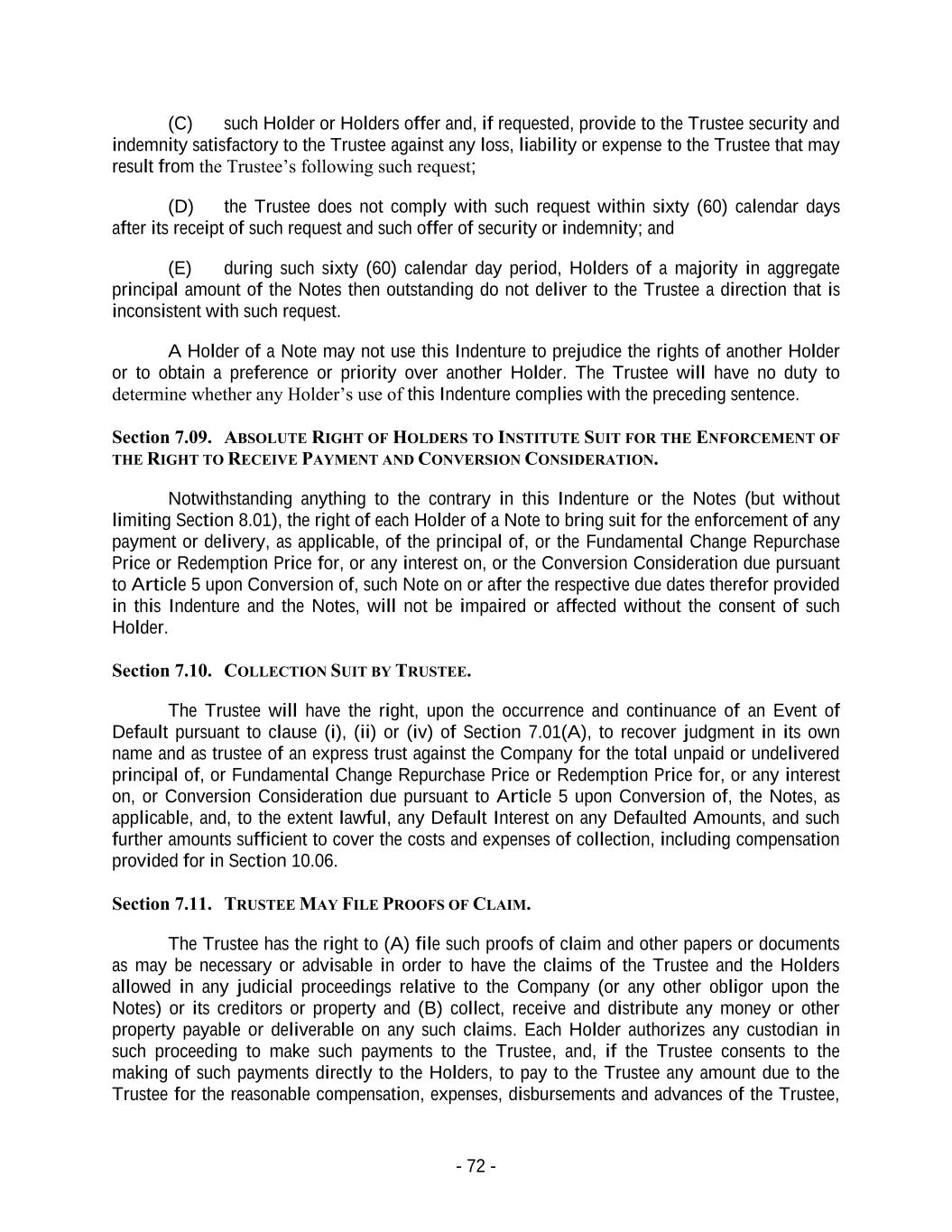 - 72 - (C) such Holder or Holders offer and, if requested, provide to the Trustee security and indemnity satisfactory to the Trustee against any loss, liability or expense to the Trustee that may result from the Trustee’s following such request; (D) the Trustee does not comply with such request within sixty (60) calendar days after its receipt of such request and such offer of security or indemnity; and (E) during such sixty (60) calendar day period, Holders of a majority in aggregate principal amount of the Notes then outstanding do not deliver to the Trustee a direction that is inconsistent with such request. A Holder of a Note may not use this Indenture to prejudice the rights of another Holder or to obtain a preference or priority over another Holder. The Trustee will have no duty to determine whether any Holder’s use of this Indenture complies with the preceding sentence. Section 7.09. ABSOLUTE RIGHT OF HOLDERS TO INSTITUTE SUIT FOR THE ENFORCEMENT OF THE RIGHT TO RECEIVE PAYMENT AND CONVERSION CONSIDERATION. Notwithstanding anything to the contrary in this Indenture or the Notes (but without limiting Section 8.01), the right of each Holder of a Note to bring suit for the enforcement of any payment or delivery, as applicable, of the principal of, or the Fundamental Change Repurchase Price or Redemption Price for, or any interest on, or the Conversion Consideration due pursuant to Article 5 upon Conversion of, such Note on or after the respective due dates therefor provided in this Indenture and the Notes, will not be impaired or affected without the consent of such Holder. Section 7.10. COLLECTION SUIT BY TRUSTEE. The Trustee will have the right, upon the occurrence and continuance of an Event of Default pursuant to clause (i), (ii) or (iv) of Section 7.01(A), to recover judgment in its own name and as trustee of an express trust against the Company for the total unpaid or undelivered principal of, or Fundamental Change Repurchase Price or Redemption Price for, or any interest on, or Conversion Consideration due pursuant to Article 5 upon Conversion of, the Notes, as applicable, and, to the extent lawful, any Default Interest on any Defaulted Amounts, and such further amounts sufficient to cover the costs and expenses of collection, including compensation provided for in Section 10.06. Section 7.11. TRUSTEE MAY FILE PROOFS OF CLAIM. The Trustee has the right to (A) file such proofs of claim and other papers or documents as may be necessary or advisable in order to have the claims of the Trustee and the Holders allowed in any judicial proceedings relative to the Company (or any other obligor upon the Notes) or its creditors or property and (B) collect, receive and distribute any money or other property payable or deliverable on any such claims. Each Holder authorizes any custodian in such proceeding to make such payments to the Trustee, and, if the Trustee consents to the making of such payments directly to the Holders, to pay to the Trustee any amount due to the Trustee for the reasonable compensation, expenses, disbursements and advances of the Trustee,