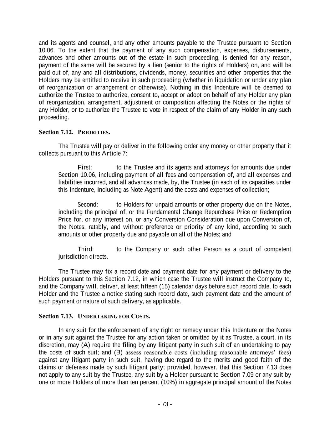 - 73 - and its agents and counsel, and any other amounts payable to the Trustee pursuant to Section 10.06. To the extent that the payment of any such compensation, expenses, disbursements, advances and other amounts out of the estate in such proceeding, is denied for any reason, payment of the same will be secured by a lien (senior to the rights of Holders) on, and will be paid out of, any and all distributions, dividends, money, securities and other properties that the Holders may be entitled to receive in such proceeding (whether in liquidation or under any plan of reorganization or arrangement or otherwise). Nothing in this Indenture will be deemed to authorize the Trustee to authorize, consent to, accept or adopt on behalf of any Holder any plan of reorganization, arrangement, adjustment or composition affecting the Notes or the rights of any Holder, or to authorize the Trustee to vote in respect of the claim of any Holder in any such proceeding. Section 7.12. PRIORITIES. The Trustee will pay or deliver in the following order any money or other property that it collects pursuant to this Article 7: First: to the Trustee and its agents and attorneys for amounts due under Section 10.06, including payment of all fees and compensation of, and all expenses and liabilities incurred, and all advances made, by, the Trustee (in each of its capacities under this Indenture, including as Note Agent) and the costs and expenses of collection; Second: to Holders for unpaid amounts or other property due on the Notes, including the principal of, or the Fundamental Change Repurchase Price or Redemption Price for, or any interest on, or any Conversion Consideration due upon Conversion of, the Notes, ratably, and without preference or priority of any kind, according to such amounts or other property due and payable on all of the Notes; and Third: to the Company or such other Person as a court of competent jurisdiction directs. The Trustee may fix a record date and payment date for any payment or delivery to the Holders pursuant to this Section 7.12, in which case the Trustee will instruct the Company to, and the Company will, deliver, at least fifteen (15) calendar days before such record date, to each Holder and the Trustee a notice stating such record date, such payment date and the amount of such payment or nature of such delivery, as applicable. Section 7.13. UNDERTAKING FOR COSTS. In any suit for the enforcement of any right or remedy under this Indenture or the Notes or in any suit against the Trustee for any action taken or omitted by it as Trustee, a court, in its discretion, may (A) require the filing by any litigant party in such suit of an undertaking to pay the costs of such suit; and (B) assess reasonable costs (including reasonable attorneys’ fees) against any litigant party in such suit, having due regard to the merits and good faith of the claims or defenses made by such litigant party; provided, however, that this Section 7.13 does not apply to any suit by the Trustee, any suit by a Holder pursuant to Section 7.09 or any suit by one or more Holders of more than ten percent (10%) in aggregate principal amount of the Notes