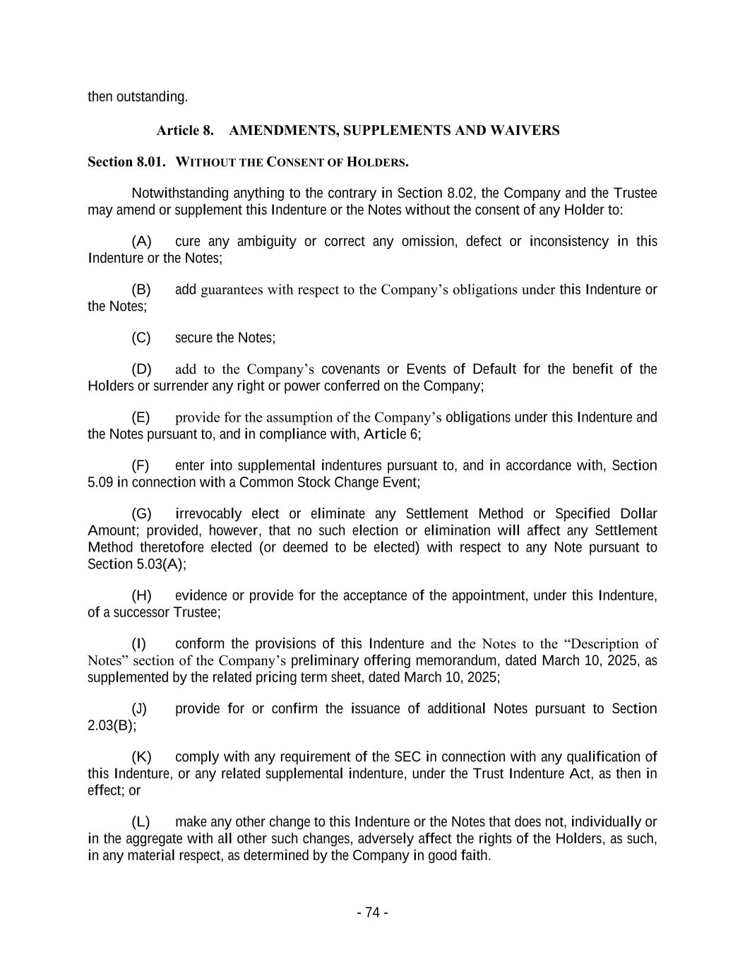 - 74 - then outstanding. Article 8. AMENDMENTS, SUPPLEMENTS AND WAIVERS Section 8.01. WITHOUT THE CONSENT OF HOLDERS. Notwithstanding anything to the contrary in Section 8.02, the Company and the Trustee may amend or supplement this Indenture or the Notes without the consent of any Holder to: (A) cure any ambiguity or correct any omission, defect or inconsistency in this Indenture or the Notes; (B) add guarantees with respect to the Company’s obligations under this Indenture or the Notes; (C) secure the Notes; (D) add to the Company’s covenants or Events of Default for the benefit of the Holders or surrender any right or power conferred on the Company; (E) provide for the assumption of the Company’s obligations under this Indenture and the Notes pursuant to, and in compliance with, Article 6; (F) enter into supplemental indentures pursuant to, and in accordance with, Section 5.09 in connection with a Common Stock Change Event; (G) irrevocably elect or eliminate any Settlement Method or Specified Dollar Amount; provided, however, that no such election or elimination will affect any Settlement Method theretofore elected (or deemed to be elected) with respect to any Note pursuant to Section 5.03(A); (H) evidence or provide for the acceptance of the appointment, under this Indenture, of a successor Trustee; (I) conform the provisions of this Indenture and the Notes to the “Description of Notes” section of the Company’s preliminary offering memorandum, dated March 10, 2025, as supplemented by the related pricing term sheet, dated March 10, 2025; (J) provide for or confirm the issuance of additional Notes pursuant to Section 2.03(B); (K) comply with any requirement of the SEC in connection with any qualification of this Indenture, or any related supplemental indenture, under the Trust Indenture Act, as then in effect; or (L) make any other change to this Indenture or the Notes that does not, individually or in the aggregate with all other such changes, adversely affect the rights of the Holders, as such, in any material respect, as determined by the Company in good faith.