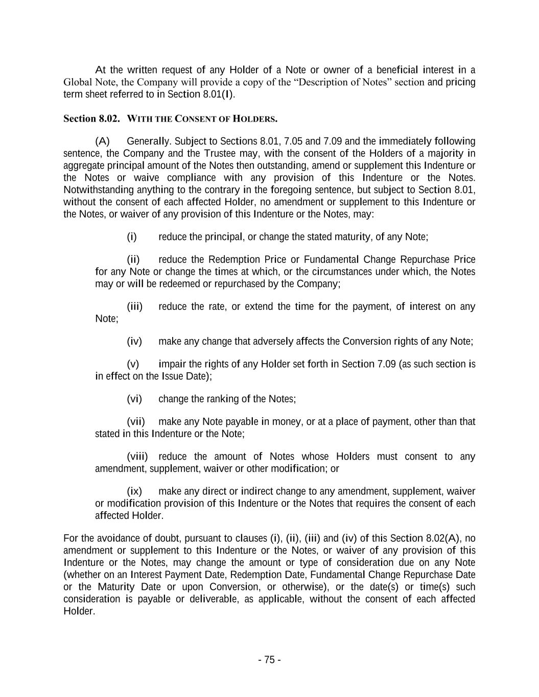 - 75 - At the written request of any Holder of a Note or owner of a beneficial interest in a Global Note, the Company will provide a copy of the “Description of Notes” section and pricing term sheet referred to in Section 8.01(I). Section 8.02. WITH THE CONSENT OF HOLDERS. (A) Generally. Subject to Sections 8.01, 7.05 and 7.09 and the immediately following sentence, the Company and the Trustee may, with the consent of the Holders of a majority in aggregate principal amount of the Notes then outstanding, amend or supplement this Indenture or the Notes or waive compliance with any provision of this Indenture or the Notes. Notwithstanding anything to the contrary in the foregoing sentence, but subject to Section 8.01, without the consent of each affected Holder, no amendment or supplement to this Indenture or the Notes, or waiver of any provision of this Indenture or the Notes, may: (i) reduce the principal, or change the stated maturity, of any Note; (ii) reduce the Redemption Price or Fundamental Change Repurchase Price for any Note or change the times at which, or the circumstances under which, the Notes may or will be redeemed or repurchased by the Company; (iii) reduce the rate, or extend the time for the payment, of interest on any Note; (iv) make any change that adversely affects the Conversion rights of any Note; (v) impair the rights of any Holder set forth in Section 7.09 (as such section is in effect on the Issue Date); (vi) change the ranking of the Notes; (vii) make any Note payable in money, or at a place of payment, other than that stated in this Indenture or the Note; (viii) reduce the amount of Notes whose Holders must consent to any amendment, supplement, waiver or other modification; or (ix) make any direct or indirect change to any amendment, supplement, waiver or modification provision of this Indenture or the Notes that requires the consent of each affected Holder. For the avoidance of doubt, pursuant to clauses (i), (ii), (iii) and (iv) of this Section 8.02(A), no amendment or supplement to this Indenture or the Notes, or waiver of any provision of this Indenture or the Notes, may change the amount or type of consideration due on any Note (whether on an Interest Payment Date, Redemption Date, Fundamental Change Repurchase Date or the Maturity Date or upon Conversion, or otherwise), or the date(s) or time(s) such consideration is payable or deliverable, as applicable, without the consent of each affected Holder.