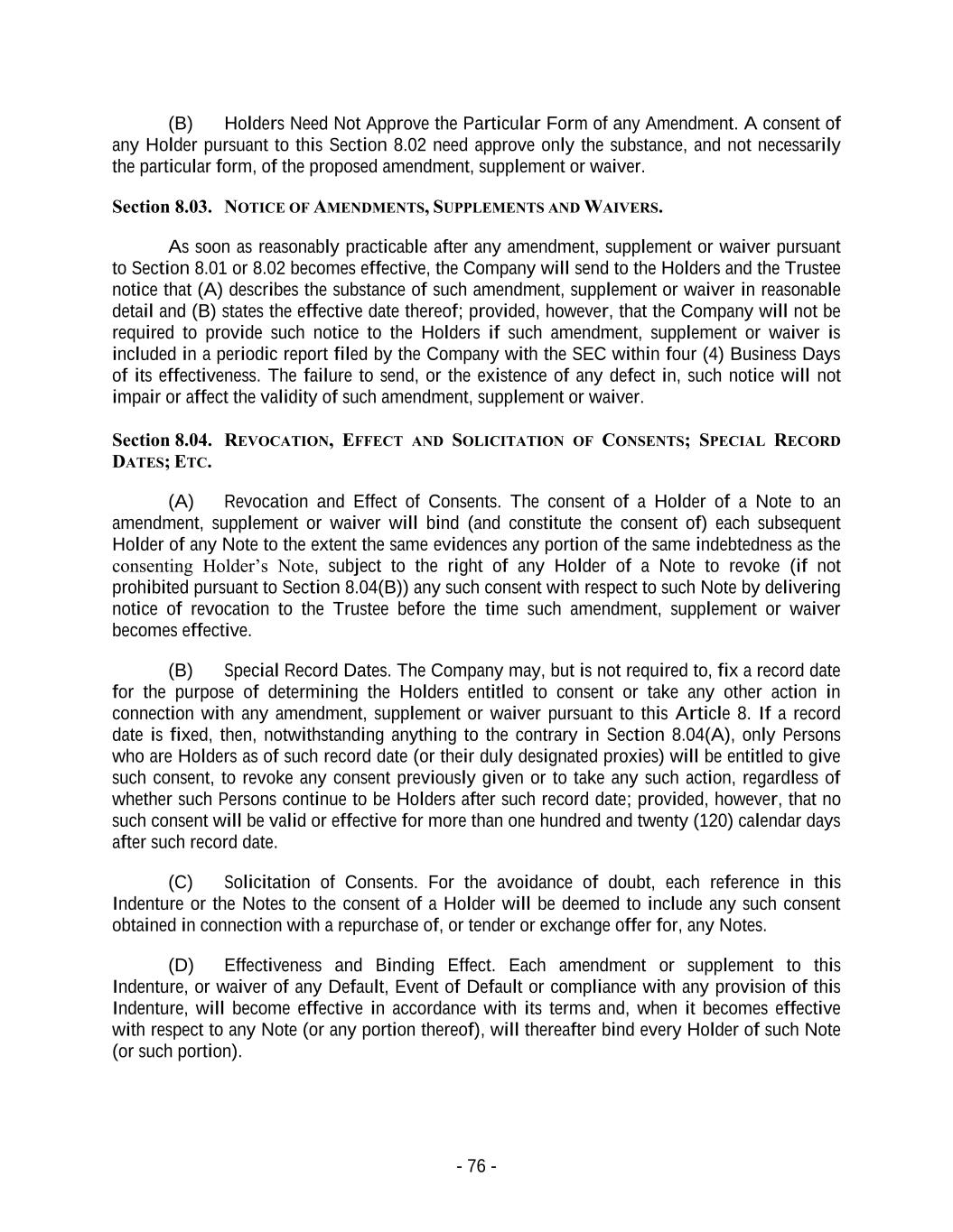 - 76 - (B) Holders Need Not Approve the Particular Form of any Amendment. A consent of any Holder pursuant to this Section 8.02 need approve only the substance, and not necessarily the particular form, of the proposed amendment, supplement or waiver. Section 8.03. NOTICE OF AMENDMENTS, SUPPLEMENTS AND WAIVERS. As soon as reasonably practicable after any amendment, supplement or waiver pursuant to Section 8.01 or 8.02 becomes effective, the Company will send to the Holders and the Trustee notice that (A) describes the substance of such amendment, supplement or waiver in reasonable detail and (B) states the effective date thereof; provided, however, that the Company will not be required to provide such notice to the Holders if such amendment, supplement or waiver is included in a periodic report filed by the Company with the SEC within four (4) Business Days of its effectiveness. The failure to send, or the existence of any defect in, such notice will not impair or affect the validity of such amendment, supplement or waiver. Section 8.04. REVOCATION, EFFECT AND SOLICITATION OF CONSENTS; SPECIAL RECORD DATES; ETC. (A) Revocation and Effect of Consents. The consent of a Holder of a Note to an amendment, supplement or waiver will bind (and constitute the consent of) each subsequent Holder of any Note to the extent the same evidences any portion of the same indebtedness as the consenting Holder’s Note, subject to the right of any Holder of a Note to revoke (if not prohibited pursuant to Section 8.04(B)) any such consent with respect to such Note by delivering notice of revocation to the Trustee before the time such amendment, supplement or waiver becomes effective. (B) Special Record Dates. The Company may, but is not required to, fix a record date for the purpose of determining the Holders entitled to consent or take any other action in connection with any amendment, supplement or waiver pursuant to this Article 8. If a record date is fixed, then, notwithstanding anything to the contrary in Section 8.04(A), only Persons who are Holders as of such record date (or their duly designated proxies) will be entitled to give such consent, to revoke any consent previously given or to take any such action, regardless of whether such Persons continue to be Holders after such record date; provided, however, that no such consent will be valid or effective for more than one hundred and twenty (120) calendar days after such record date. (C) Solicitation of Consents. For the avoidance of doubt, each reference in this Indenture or the Notes to the consent of a Holder will be deemed to include any such consent obtained in connection with a repurchase of, or tender or exchange offer for, any Notes. (D) Effectiveness and Binding Effect. Each amendment or supplement to this Indenture, or waiver of any Default, Event of Default or compliance with any provision of this Indenture, will become effective in accordance with its terms and, when it becomes effective with respect to any Note (or any portion thereof), will thereafter bind every Holder of such Note (or such portion).